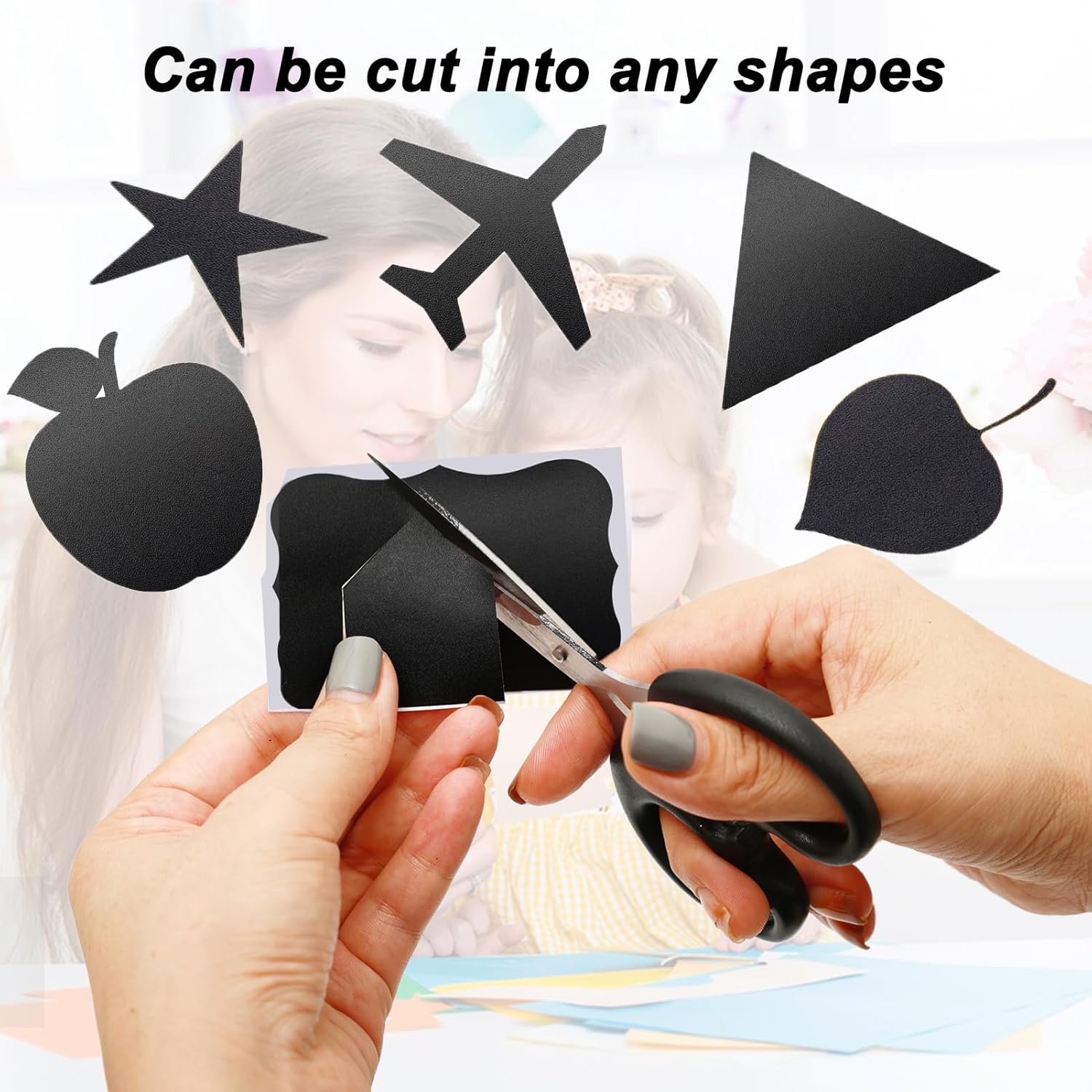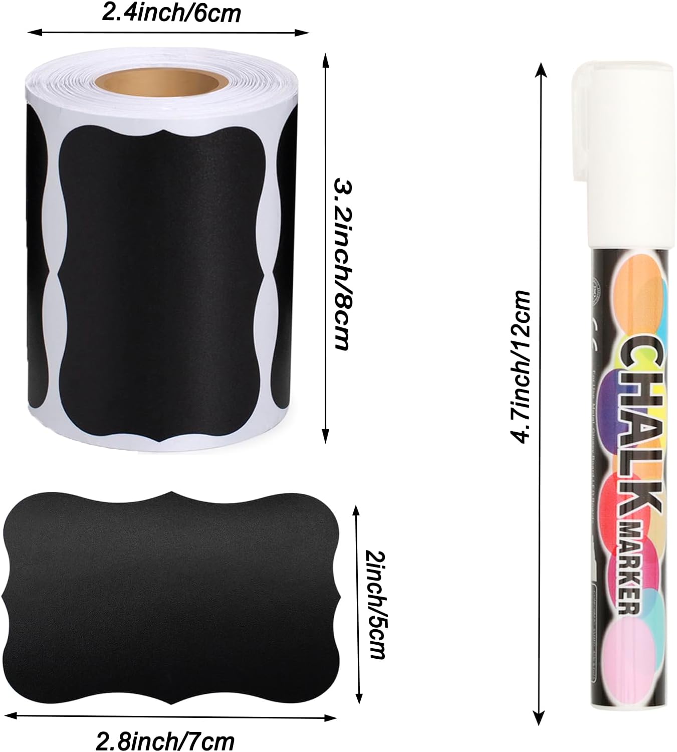 - PACKAGE INCLUDES : Each package contains a roll has 180 chalkboard labels and 1 liquid white marker pens; The removable sticker labels size is ( 2" x 2.8" ) Reasonable size let you can cut these blackboard labels into different shapes, custom personalized sticker labels use as glass bottle labels for eye-catching table numbers for wedding. The liquid chalk marker helps you write more smoothly on these black kitchen food label stickers