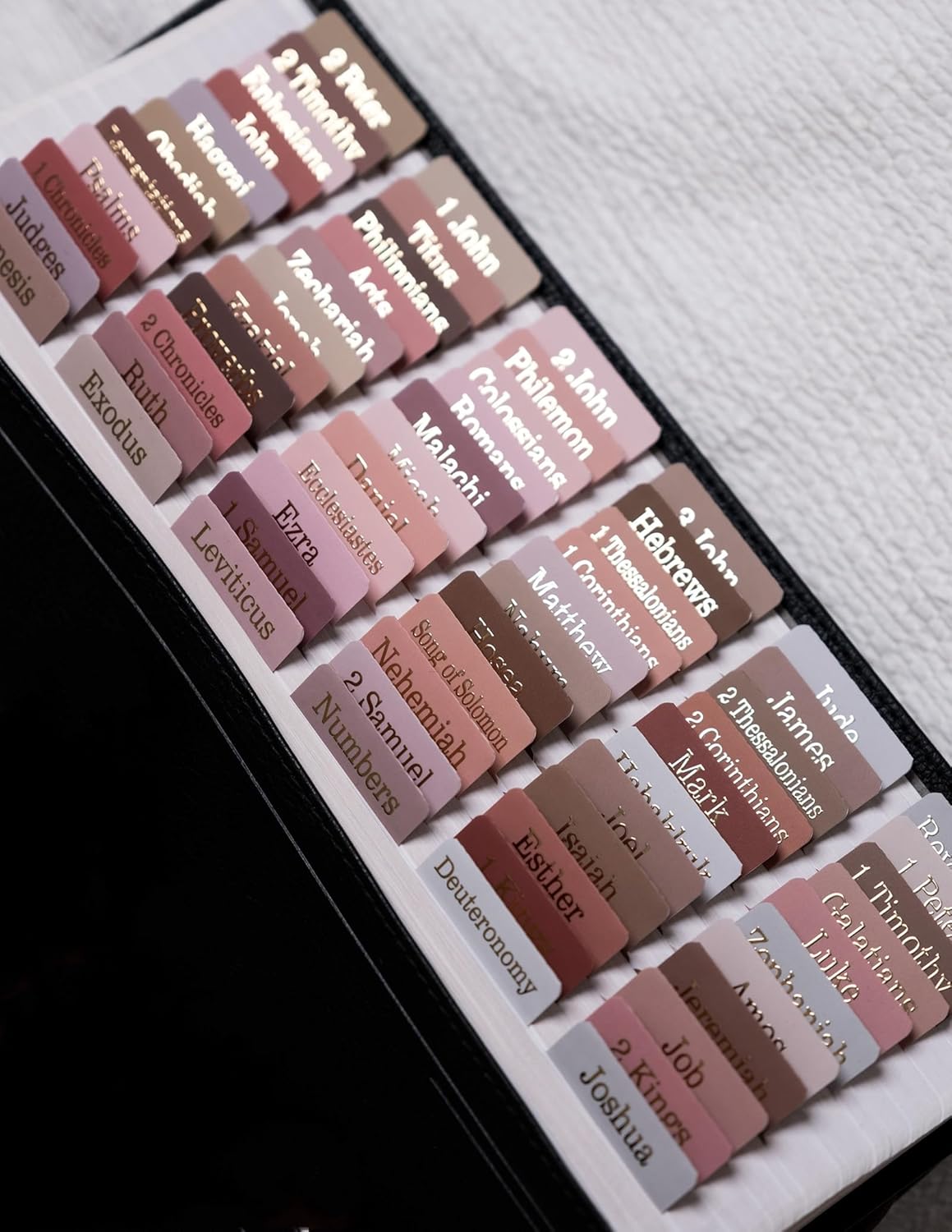 - Large Print, Easy to Read & Easy to Install: Silky velvet touch laminate,carefully designed pretty Bible accessories . The peel-and-stick Bible index tabs are self adhesive, simply align them with the provided guide or place them creatively.