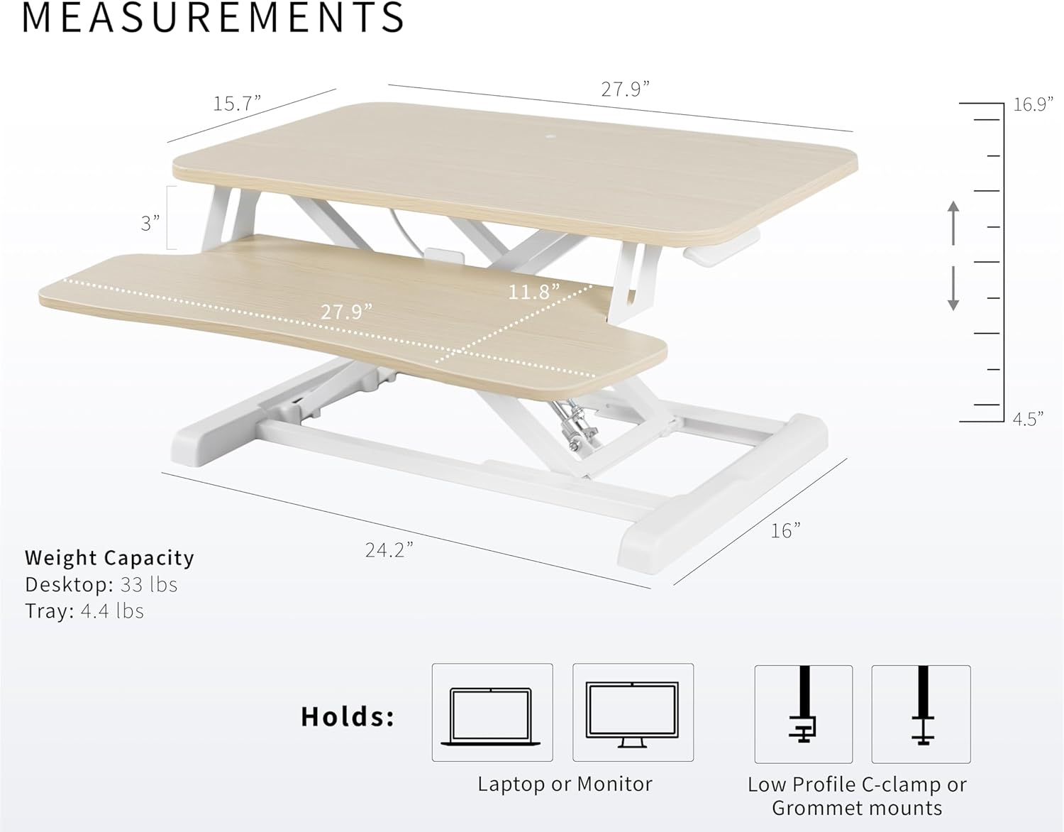- Space Efficient 28" Surface: The top surface measures 27.9” x 15.7”, which will easily fit in your workspace. The 27.9” x 11.8” (11” in center) keyboard tray raises in sync with the top surface to create a comfortable workstation