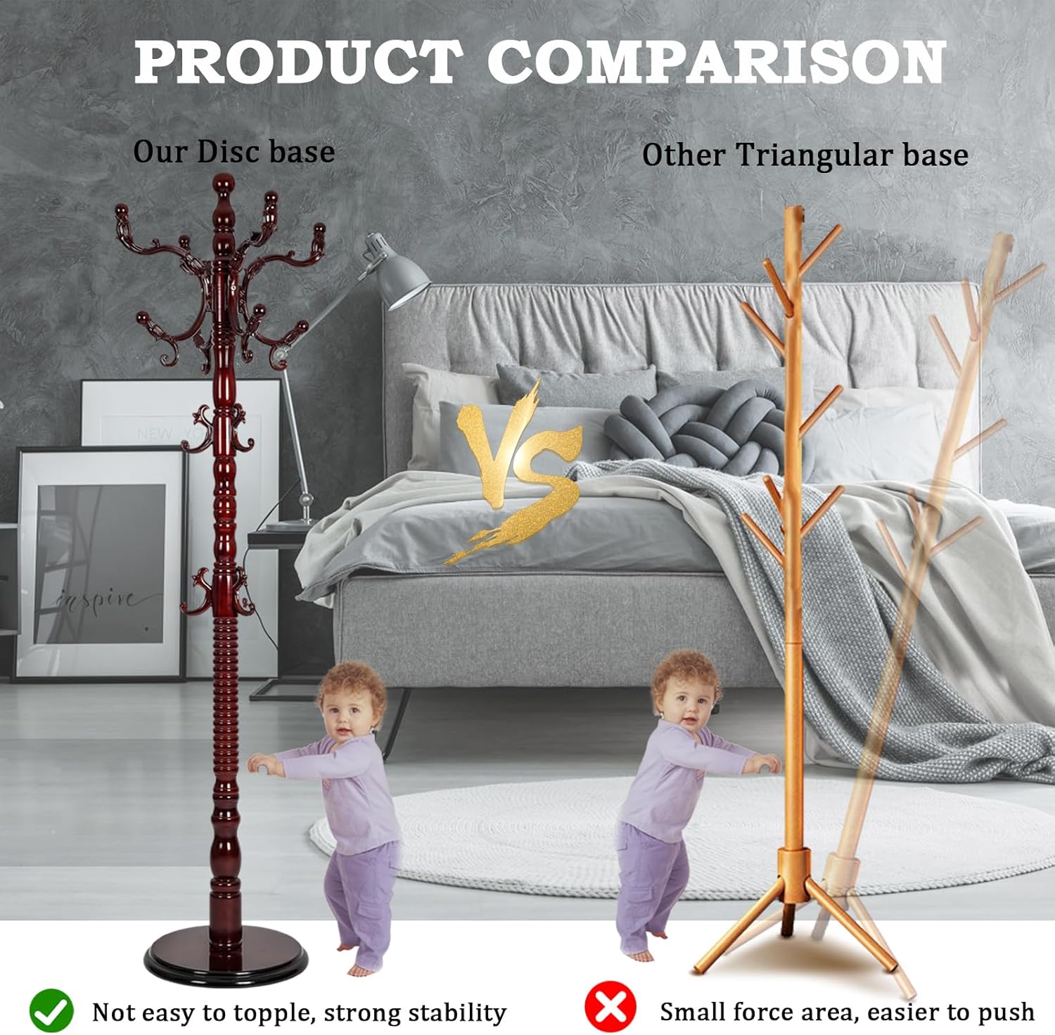Coat Racks Free Standing with 14 Hooks, Natural Wood Coat Rack with Solid Round Base, Adjustable Height Coat Racks, Easy Assembly for Hallway, Bedroom and Office (Reddish brown)