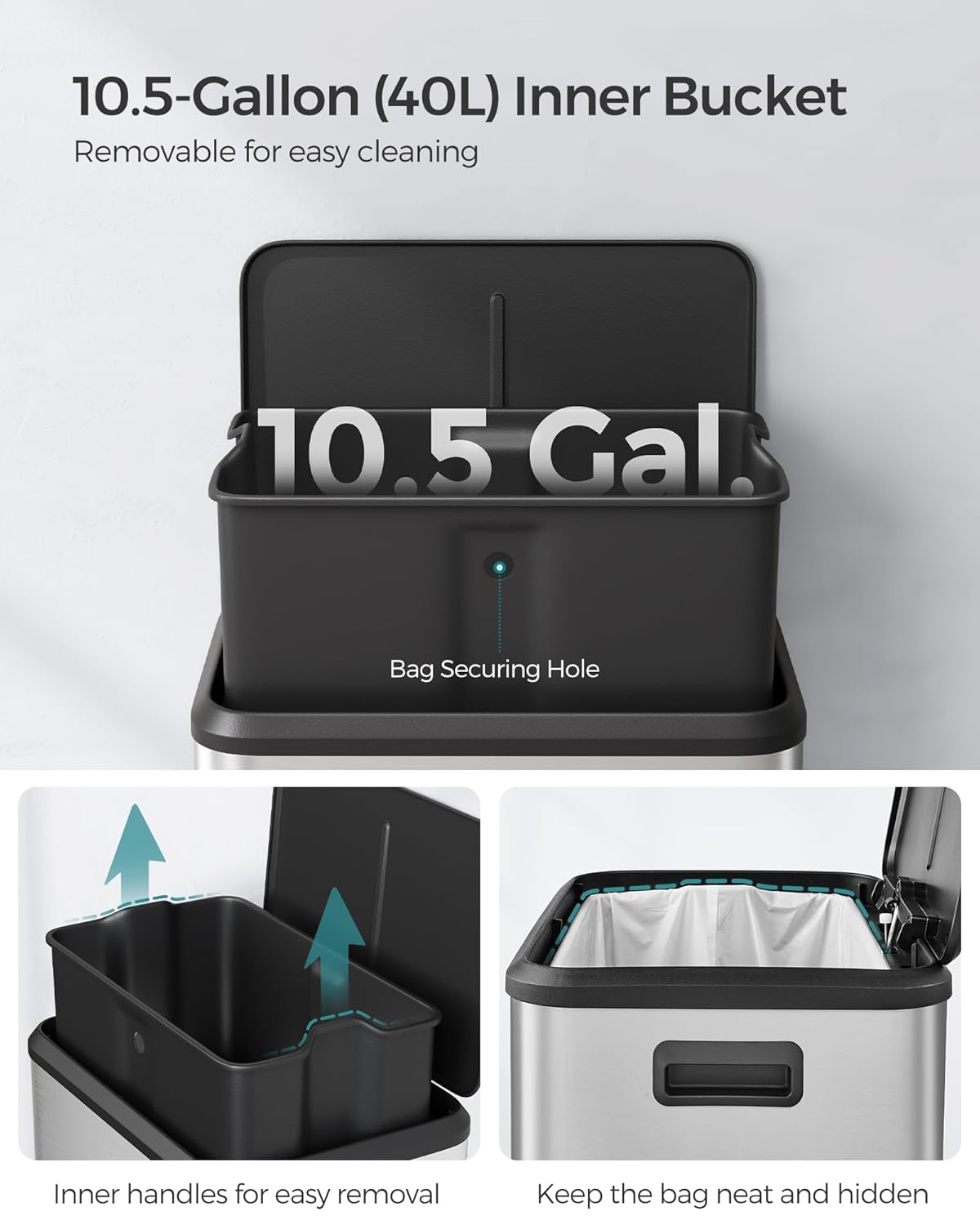 - [Compact yet Spacious] Despite its compact design, this 10.5-gallon trash can offers ample space to accommodate daily waste, making it an excellent choice for most families