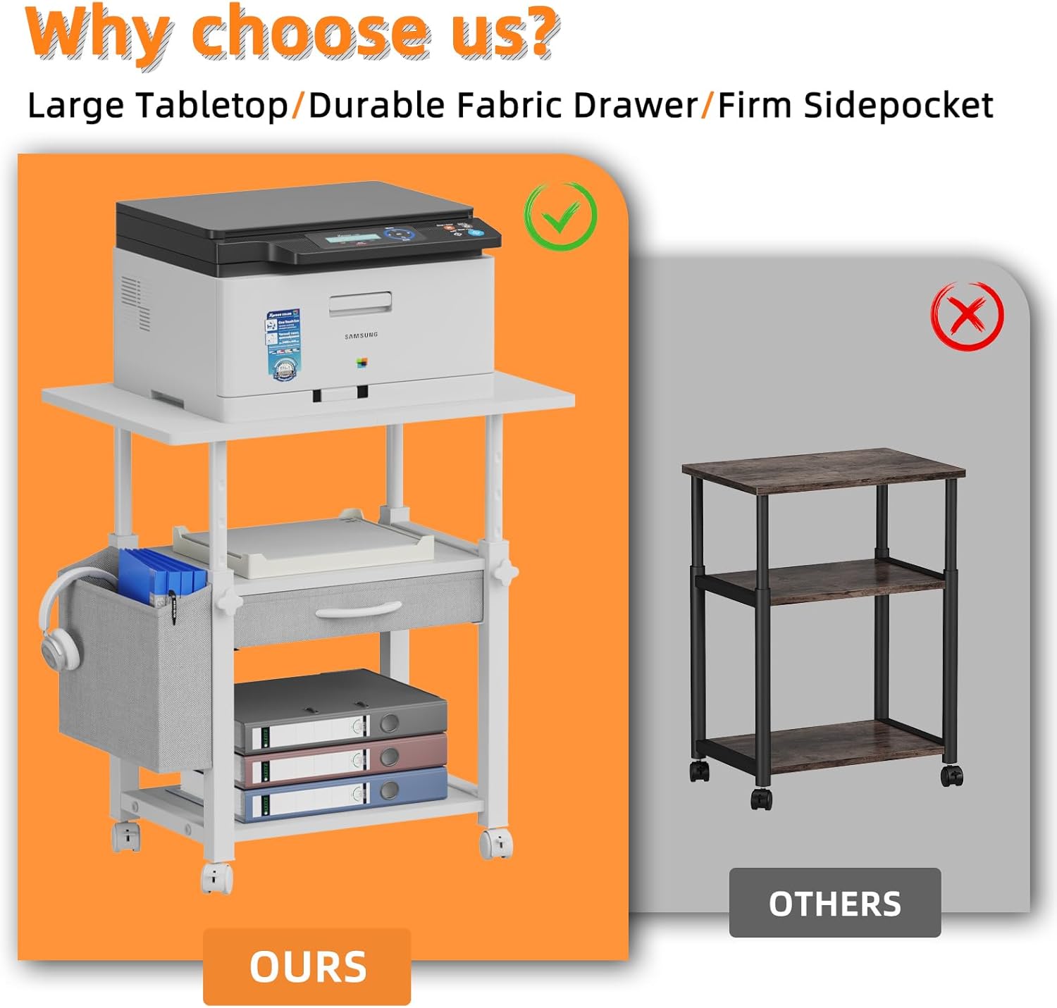 Large 22"x15" Printer Stand, 3-Tier Height Adjustable with Storage Drawer & Side Bag, Rolling Cart for Heat Press/Laser/3D Printer (White)