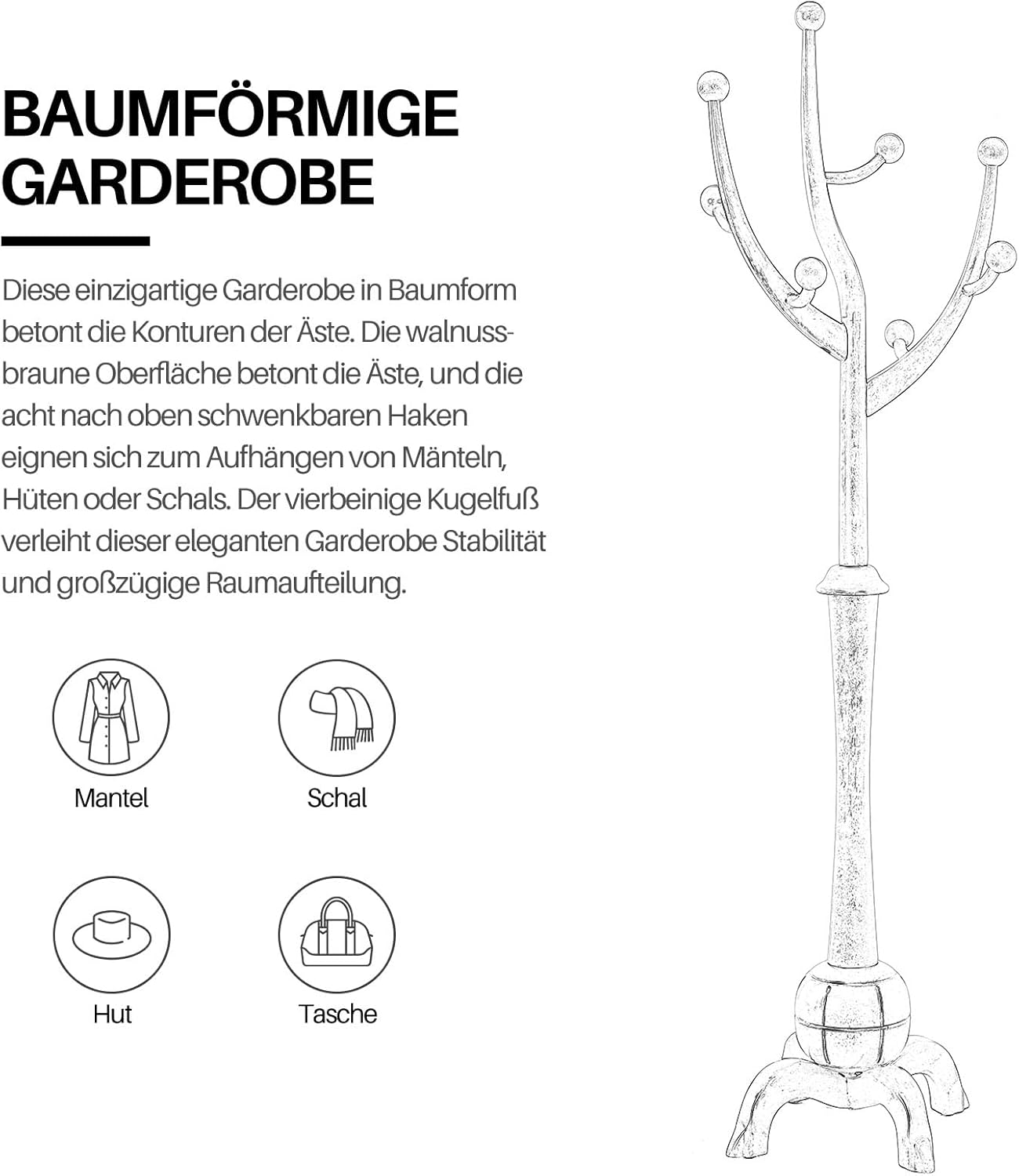 - 【Premium Material】: This tree coat rack is made from high-quality rubber wood logs, and does not contain artificial synthetic boards. The wood material exhibits an attractive grain and a walnut brown finish that makes it a lovely addition to any home