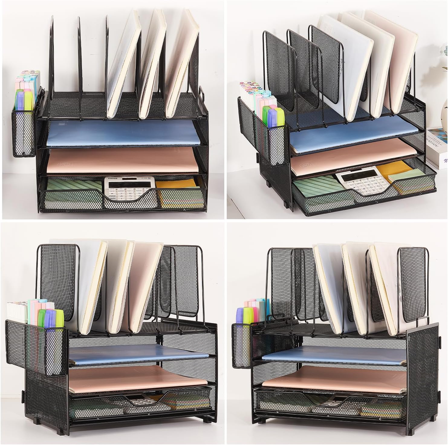 Desk Organizers and Accessories, 3-Tier Paper Organizer with 5 Vertical File Holders, File Organizer for Desk (Black With Drawer, 3T With Drawer)