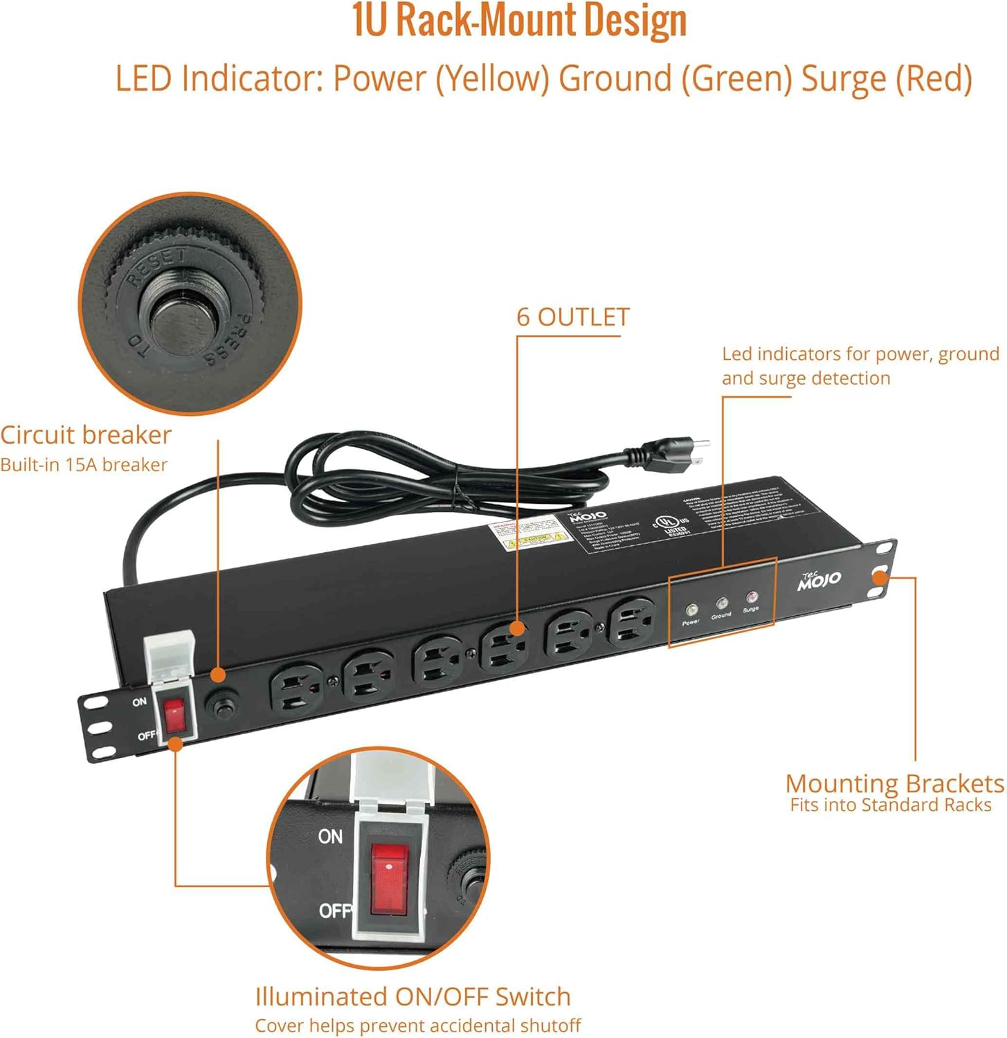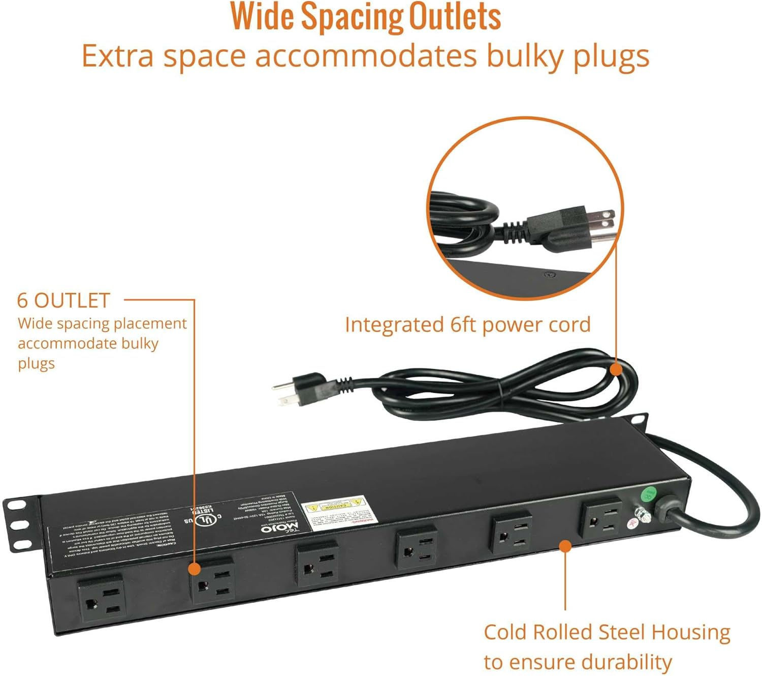 Tecmojo 1U Rackmount Network-Grade PDU Surge Protector Power Strip, 12 Outlets (6 Front, 6 Rear Wide Spaced) 12A 6ft Cord with 5-15P Lug - Black, UL Certified