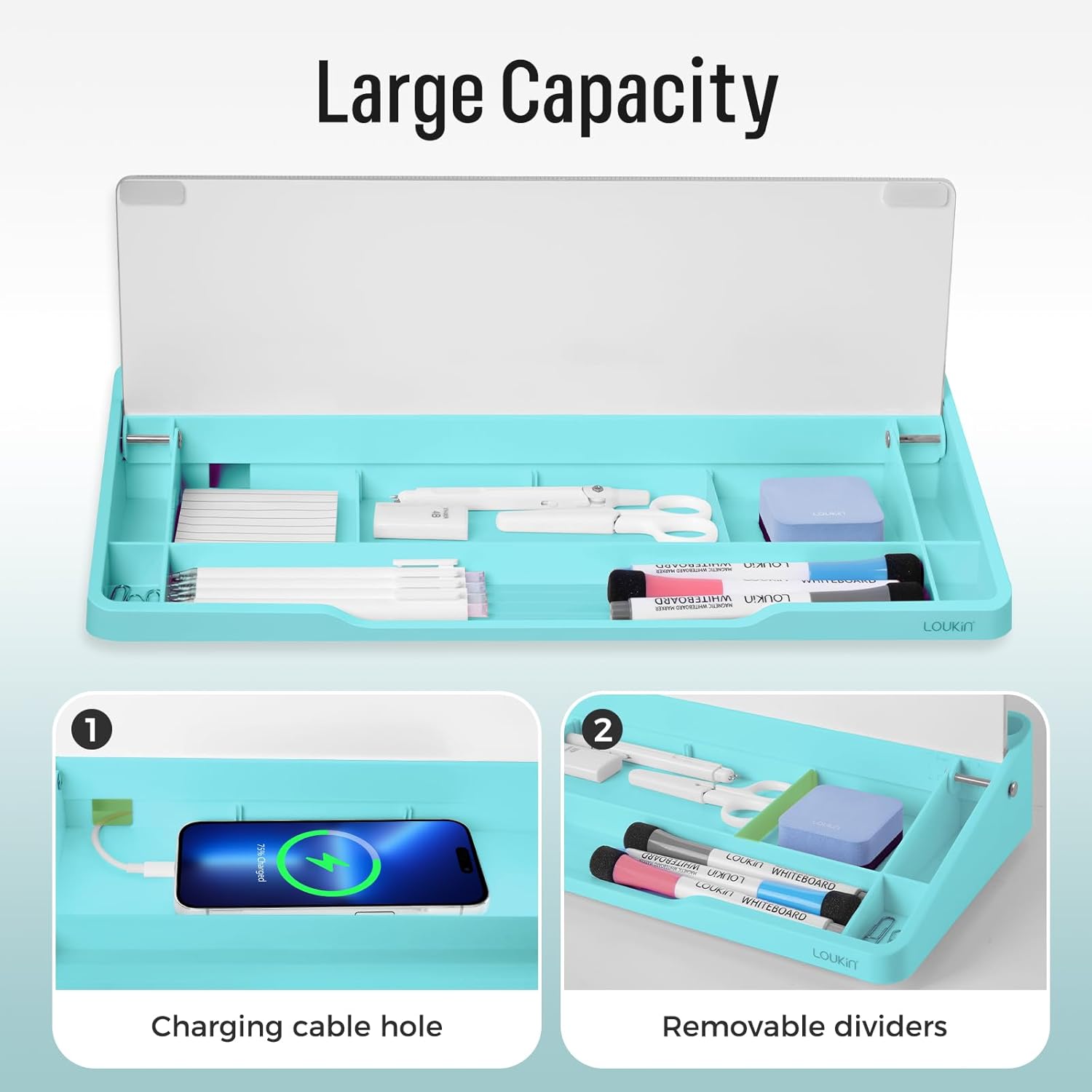 LOUKIN Glass Desktop Whiteboard, 15.3" x 5.6" Dry Erase Desk Board with Dotted and Graduated Surface, Desktop Buddy, Great for Design and Drawing, 3 Markers and 1 Dry Erase Eraser Included (Sky Blue)