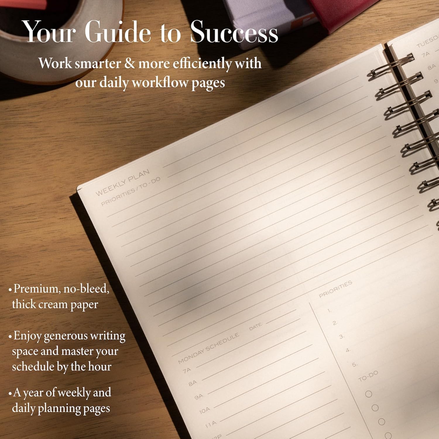 - DAILY WORKFLOW: Our planner has enough weekly and daily pages for all 52 weeks and 365 days of the year. The weekly and daily planning pages have an abundance of space for all your planning needs, ie: to organize your schedule, your daily to-do’s and priorities, appointments, notes, etc. This planner will keep you on task to achieve the best results.