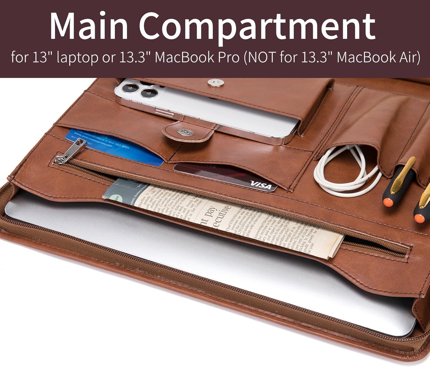 - Effortless Organization: To enhance your daily efficiency, this leather portfolio includes 2 pen loops for easy access to writing instruments, 2 business card slots for networking essentials, an earbud pocket for tangle-free earphone storage, and a dedicated cell phone holder, ensuring all your essentials are readily accessible and neatly organized. Say goodbye to disorganized bags and hello to a more streamlined and efficient workday.