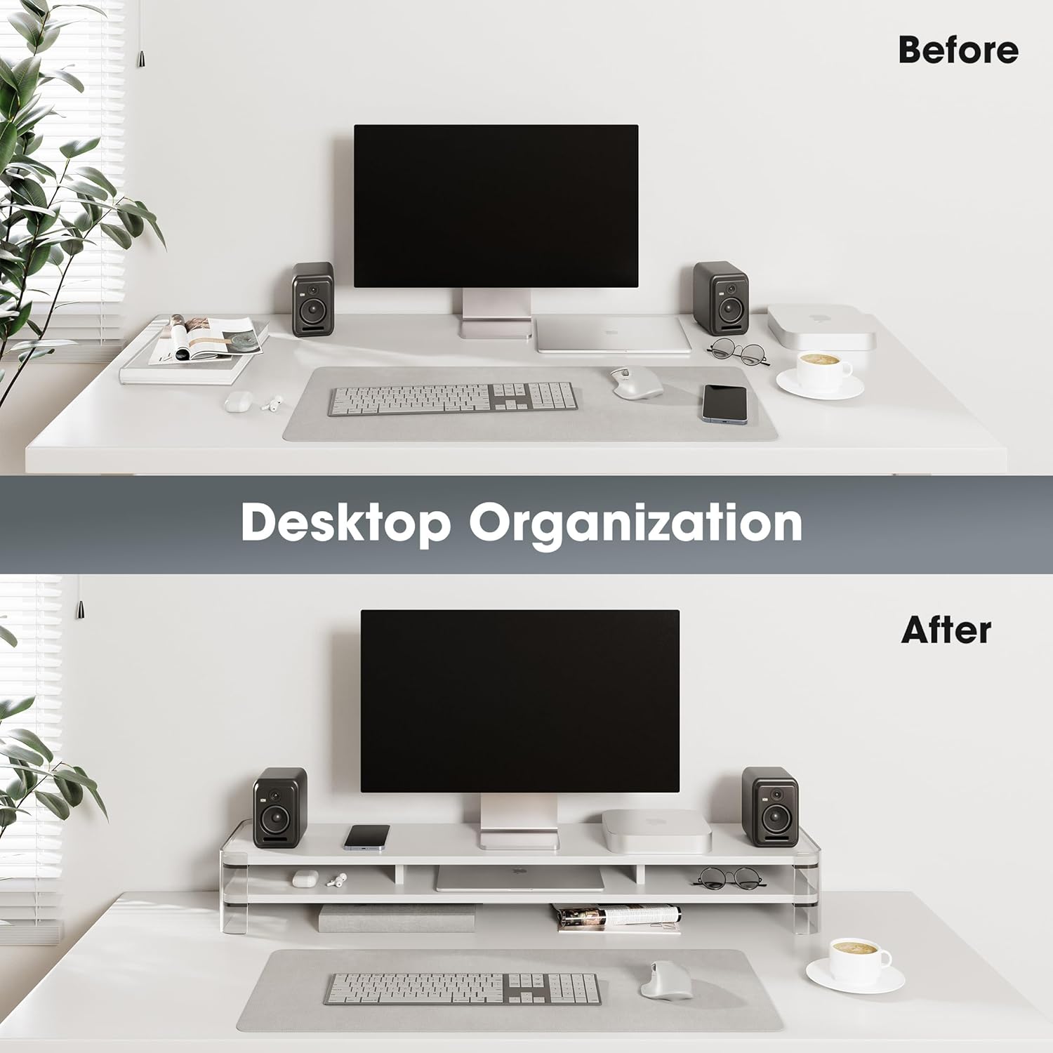 - 【Double Storage】: Acrylic monitor stand is 2 tier storage organizer for laptop, computer or tv stand. The first level with three compartments; The bottom layer is a super large space of 38.7 inches, can be used to store keyboards, mice or other office supplies, adding more storage space and making your desktop tidier.