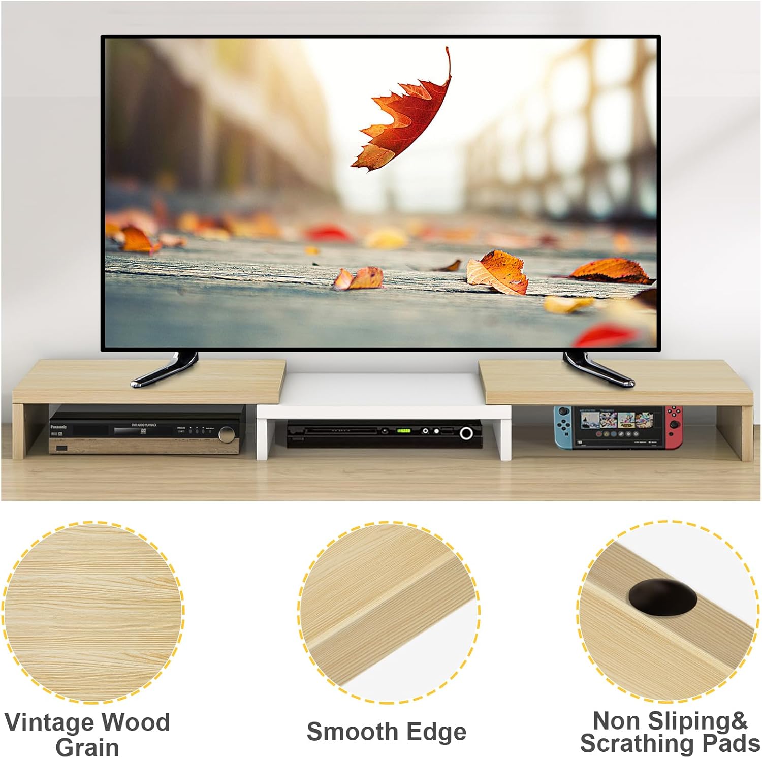 - Product Profile: The Monitor Riser for desk dimensions (33-48.2) x 9.3 x 3.7 inch (L*W*H), holds up to 44 lbs. Well made material, meticulous process and stable structure, the dual monitor stand for desk will perfectly satisfy your demand. The modern oak and white wood finish offer a clean and elegant look and create a stylish and warm home life.