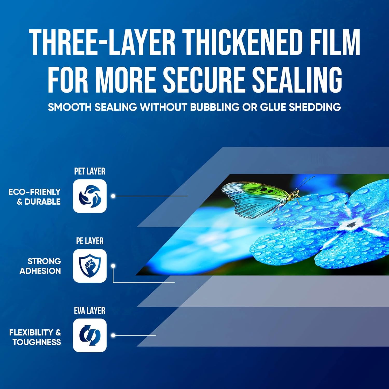 - THREE-LAYER THICKENED FILM - Ensure document integrity with Rolett laminating sheets featuring a three-layer thickened film. The PET layer ensures eco-friendly durability, the PE layer provides strong adhesion, and the EVA layer adds flexibility and toughness, maintaining document quality over time.