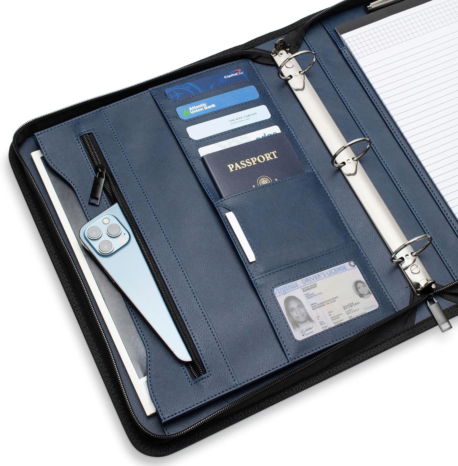 Portfolio Organizer - 3 Ring Binder with Notepad - 1.5 Inch Rings - Zippered Storage Pockets for Papers, Travel Documents, Presentation Folder, Cards, Passport, Tickets - Blue
