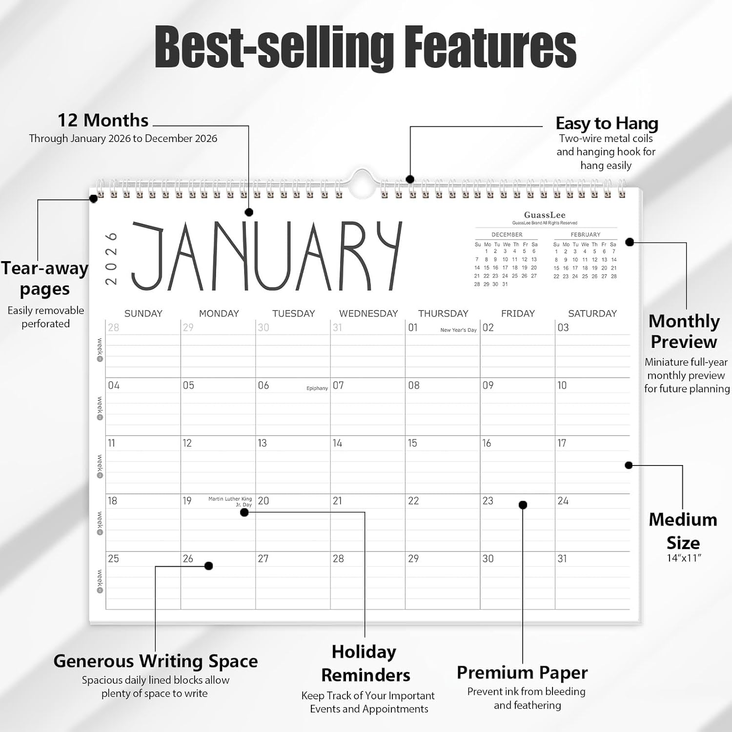 GuassLee Wall Calendar 2026, 2026 Calendar Wall from Jan. 2026 to Dec 2026, 14" X 11" Paper Monthly Planner Wall Hanging Calendar with Thick Paper for Office Home Planning & Organizing