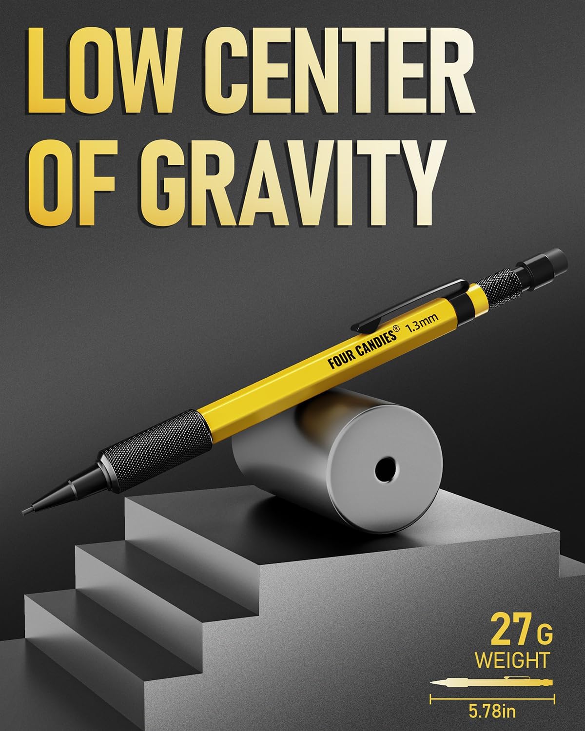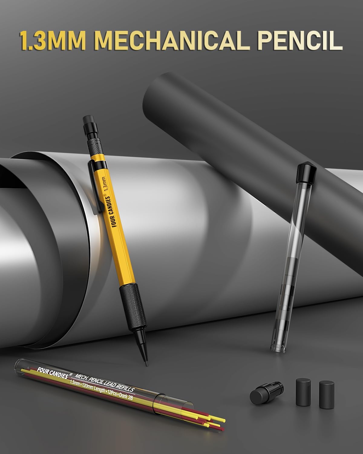 Four Candies 1.3mm Mechanical Pencil Set with 24 Lead Refills, Metal Weatherproof Heavy Duty Outdoor Carpenter Pencil, Eraser, 6 Eraser Refills for Architect Drafting Woodworking Marking with Case