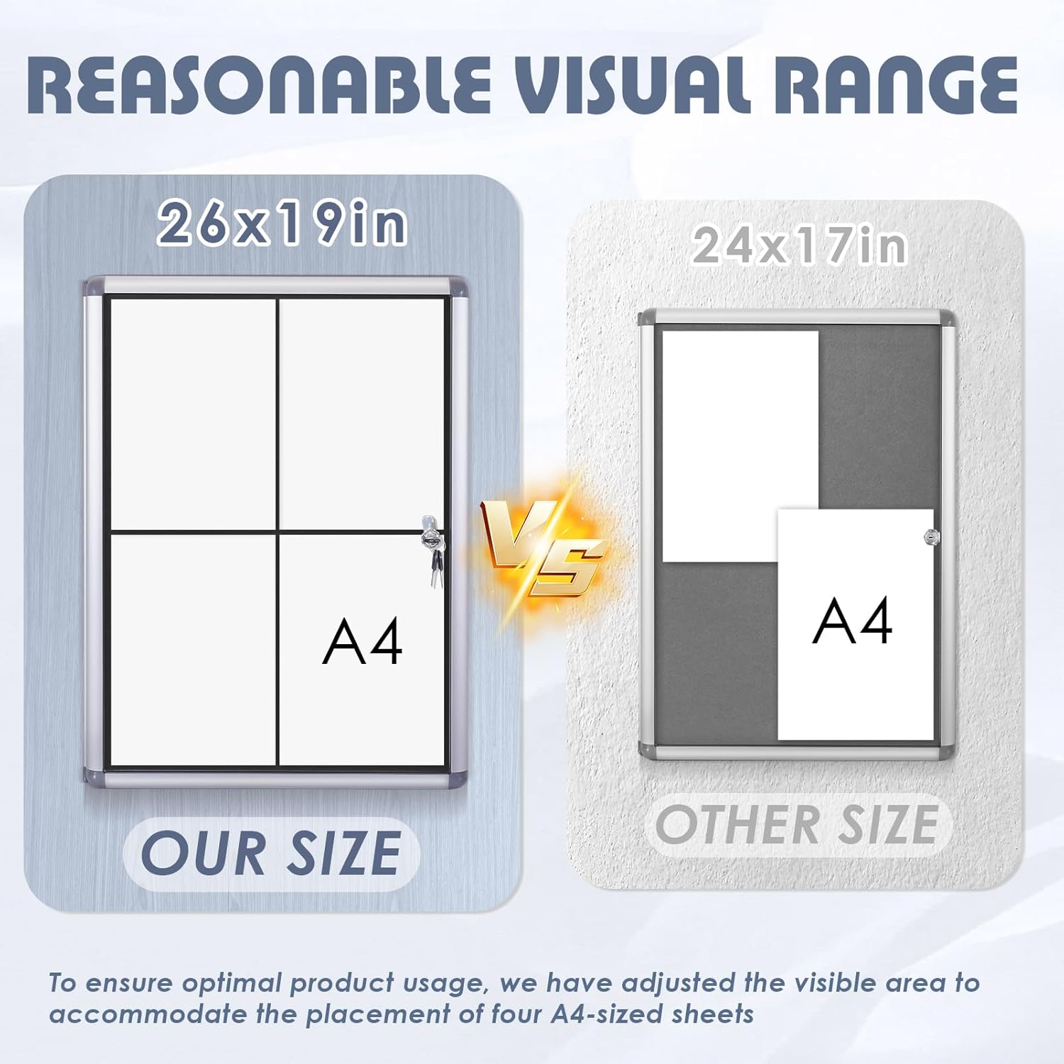 Enclosed Bulletin Board Lockable Display Case Message Board with Locking Door for Indoor, Black Felt, Silver Aluminum Frame, 26x20inch(4XA4)