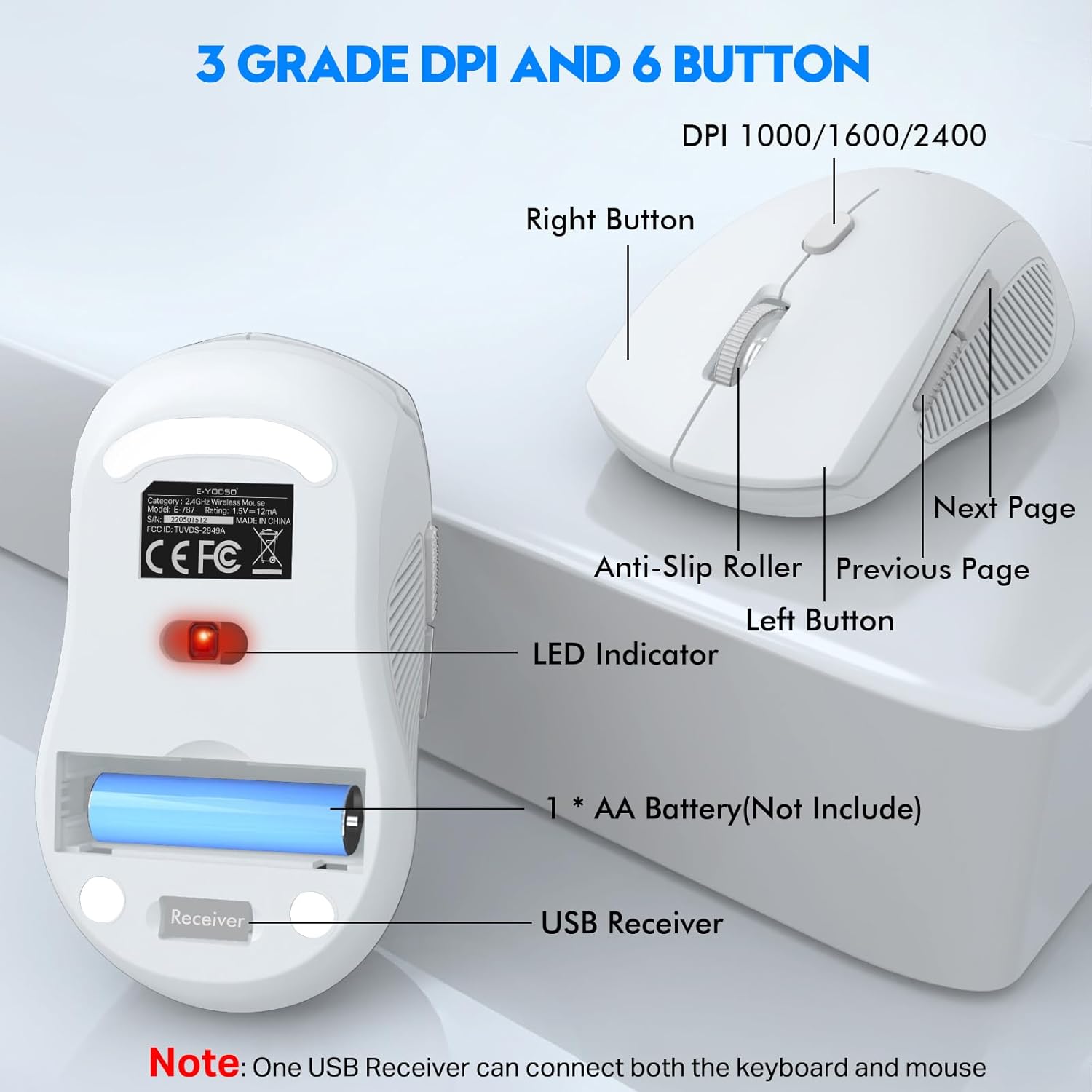 Wireless Keyboard and Mouse Combo, E-YOOSO 2.4GHz Full Sized Ergonomic Wireless Keyboard with Wrist Rest, 3 DPI Adjustable and 6 Buttons Cordless USB Mouse for Computer, Laptop, PC, Windows (White)