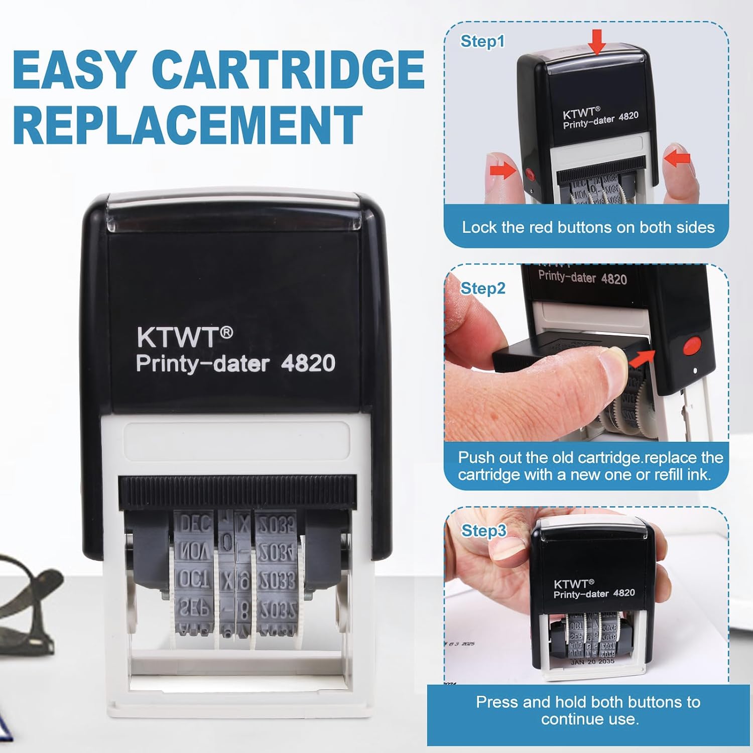 - Solid and durable construction can withstand rapid and repeated stamping, Easily change the date with 4 rotating bands.