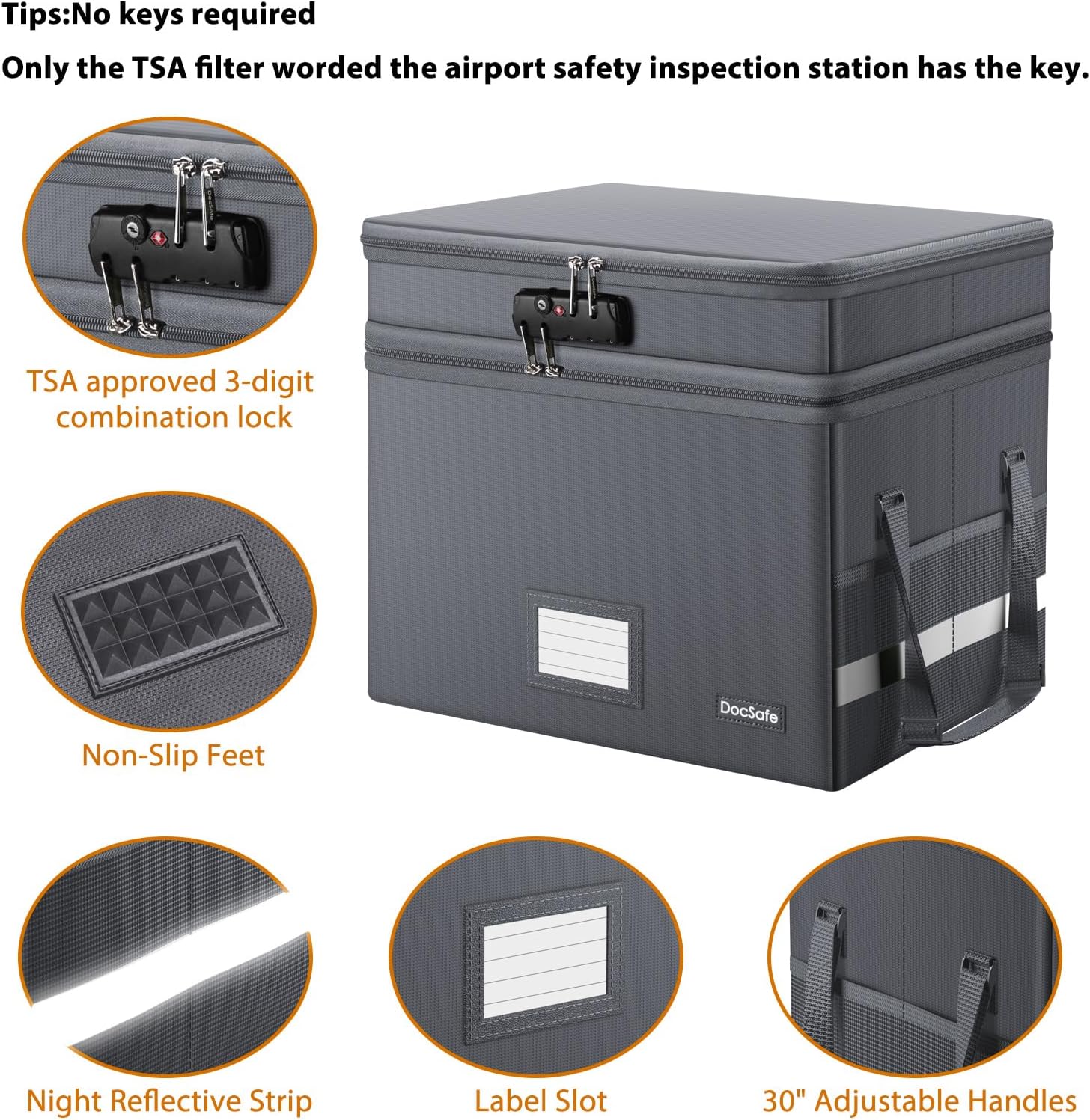 - Multi-Layer&Large-capacity(16"x13.8"x12.2"): Compared with other file boxes, our fireproof file box adopts a multi-layer design that can meet all your storage needs. These include 8 passport mesh bags, 16 card slots, 4 U disk pockets, 2 mesh bags, 4 outer pockets, 1 large pocket, and one main pocket with large space. They are ideal for storing cards, passports, CDs, USB, albums,certificates and other valuables.The main pocket can fit both letter and legal-size files or anything else you want.