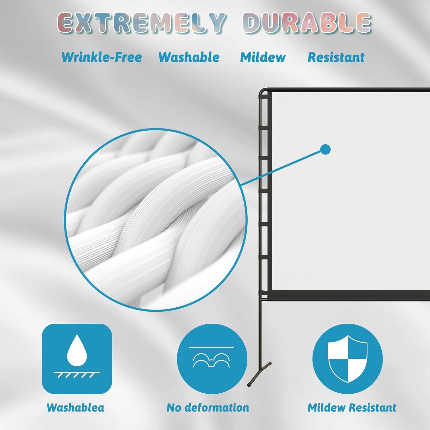 - Projector screen with stand: Premium mental material makes the projector screen stand, durable frame can be quickly installed into a rectangle with a button, very flat. Comes with extra nylon cables for better stability, with it you don't need to worry about wobble.