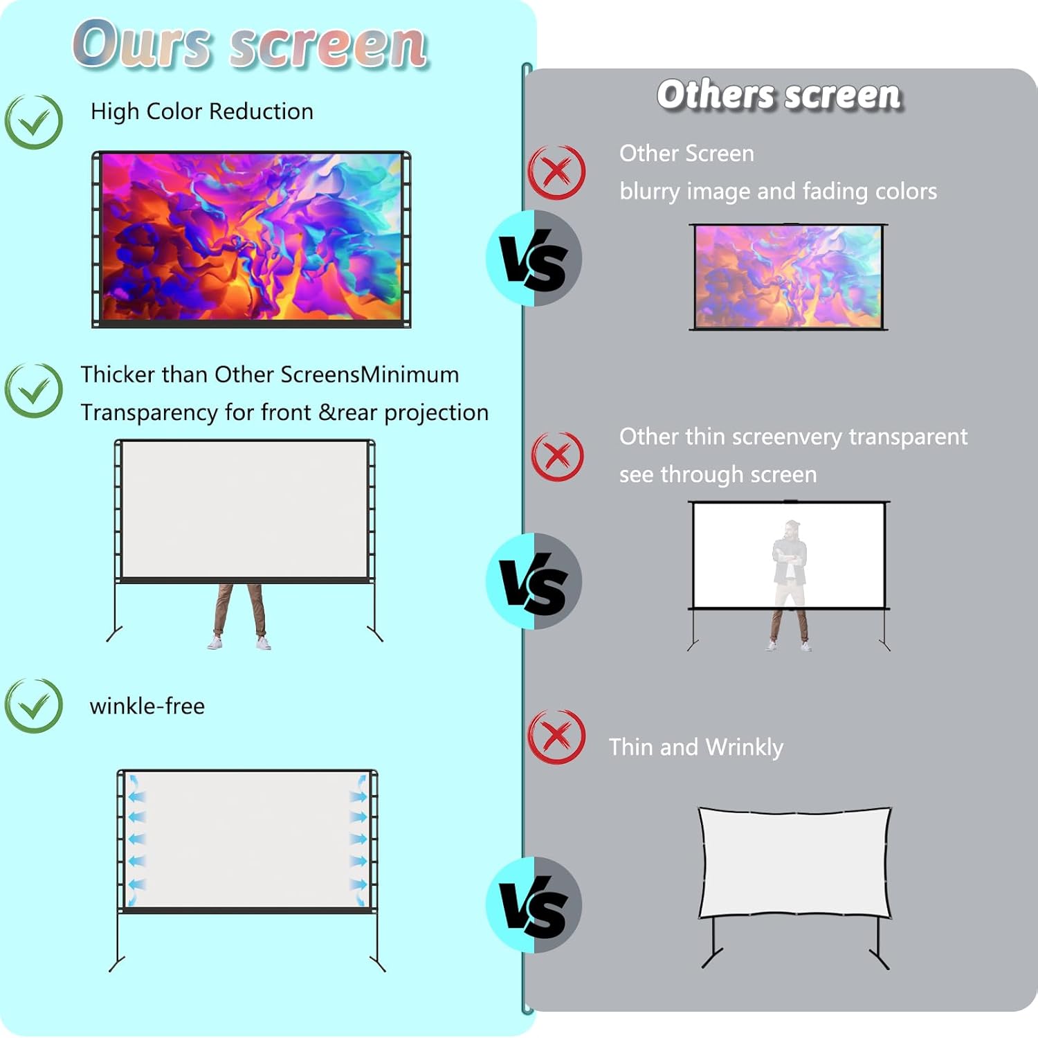 - HD Screen: Outdoor projector screen made with thick and dense cloth, Wrinkle free, 100% diffuselection, high definition display, machine washable. Screen surface provides a 1.1 gain, wide viewing angle at 160 degrees. With black backing screen prevent excessive light penetration for a better display.