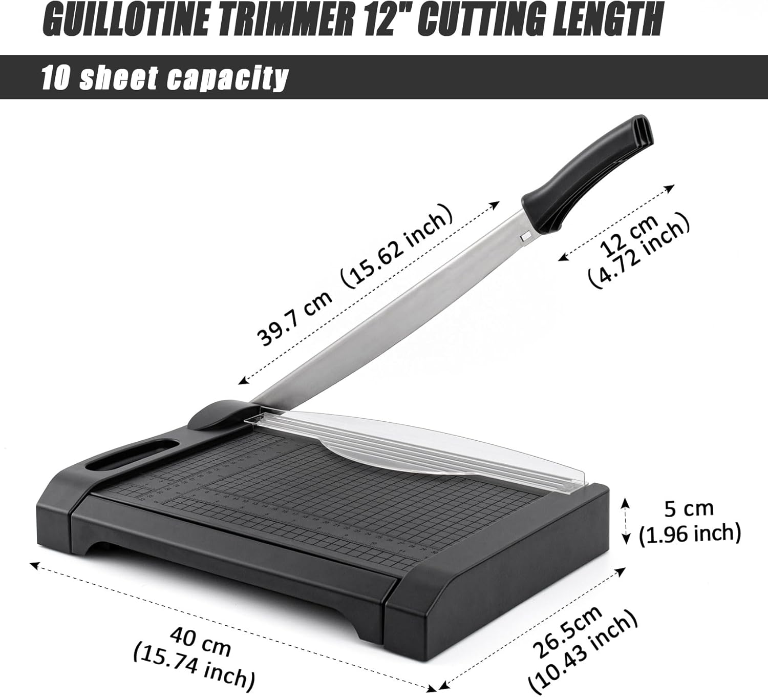 - Cutting Capacity 5 to 10 Sheet : The guillotine paper cutter easily cutting paper 5 sheets one time; After texting 10 sheets or more will take more effector for cutting and cause raw edge inch and centimeter markings for seamless cutting;Not suitable for cutting fabric leather and metal plates