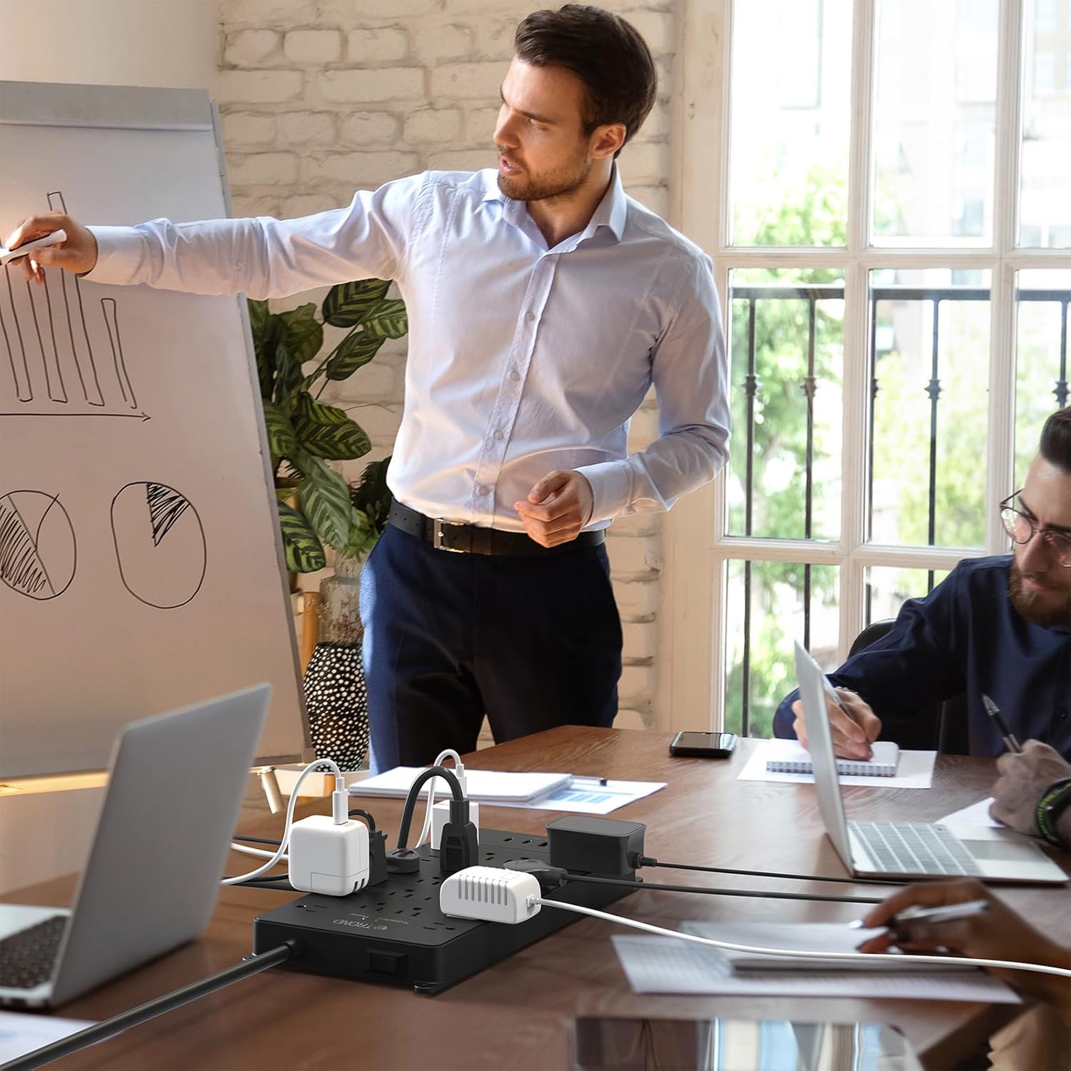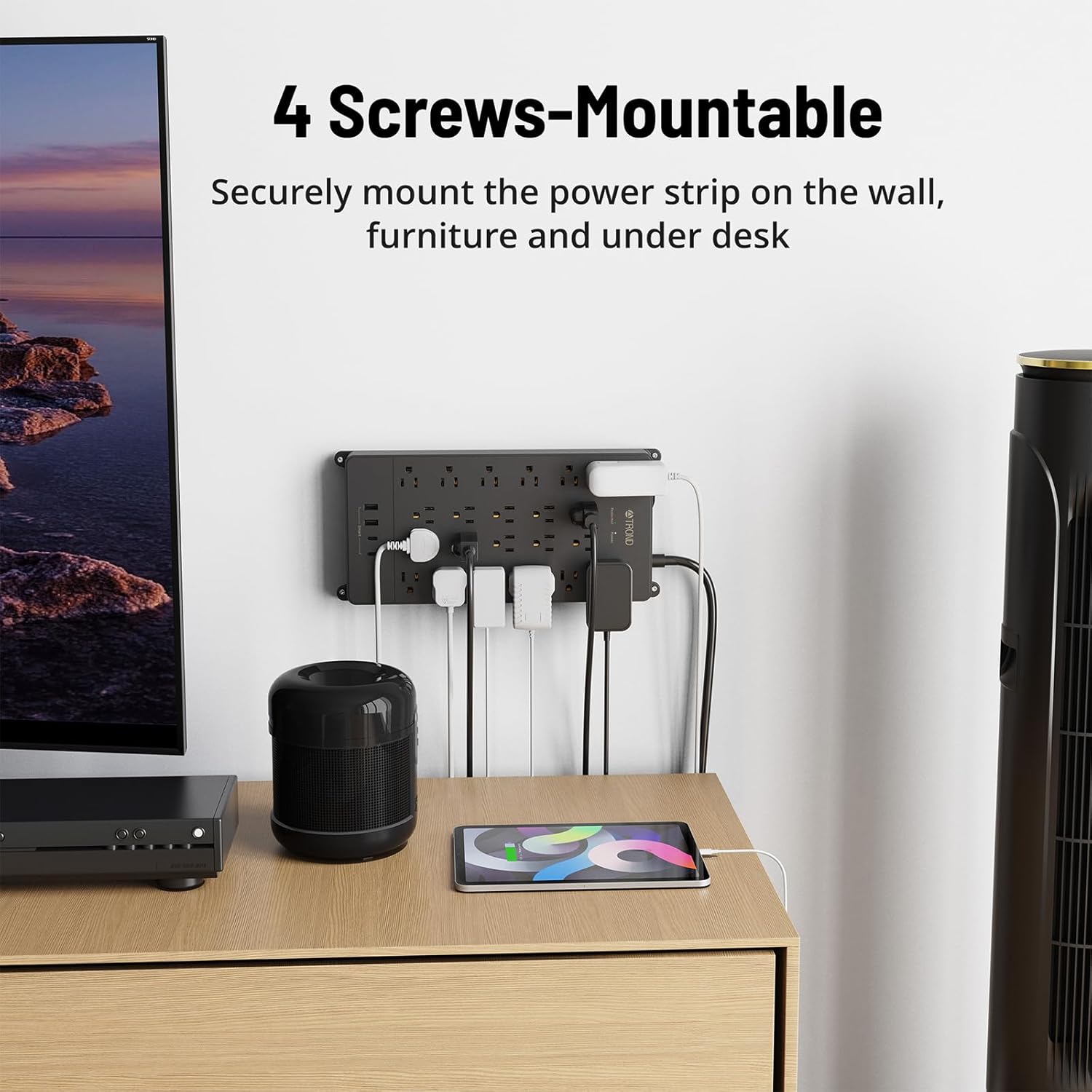 - 【Wall Mount and Flat Plug】Large power strip equipped with 4 screw holes in the corners, allows you to securely mount the surge protector box on the wall or under the desk. The 45° angle flat plug design is perfect for hiding behind furniture, bookshelves, and bedside tables in tight spaces