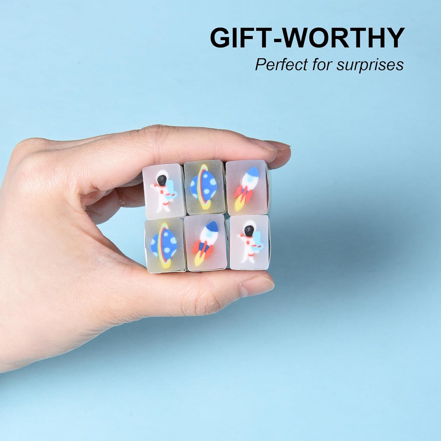 - Explore the cosmos with our 18-piece cute outer space themed erasers – perfect for kids!