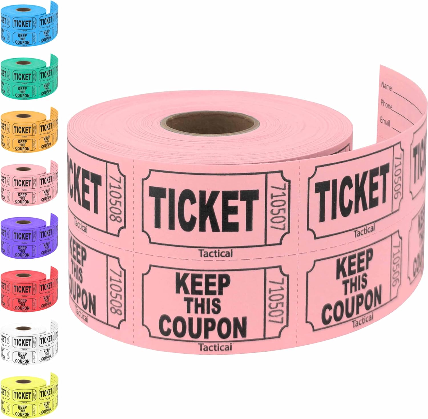- BRIGHT & VIBRANT COLORS – Tacticai colored raffle tickets come in a wide variety of brilliant colors including blue, green, orange, purple, red, white, yellow, and pink. All to match your individual event, event date, or party theme.