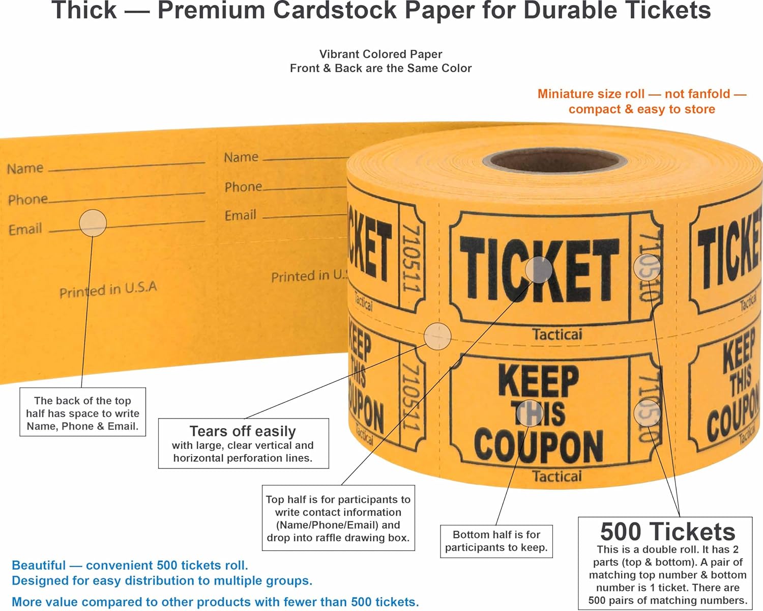 Tacticai 500 Raffle Tickets, Orange (1 of 8 Colors), Double Roll, Ticket for Events, Entry, Class Reward, Fundraiser & Prizes