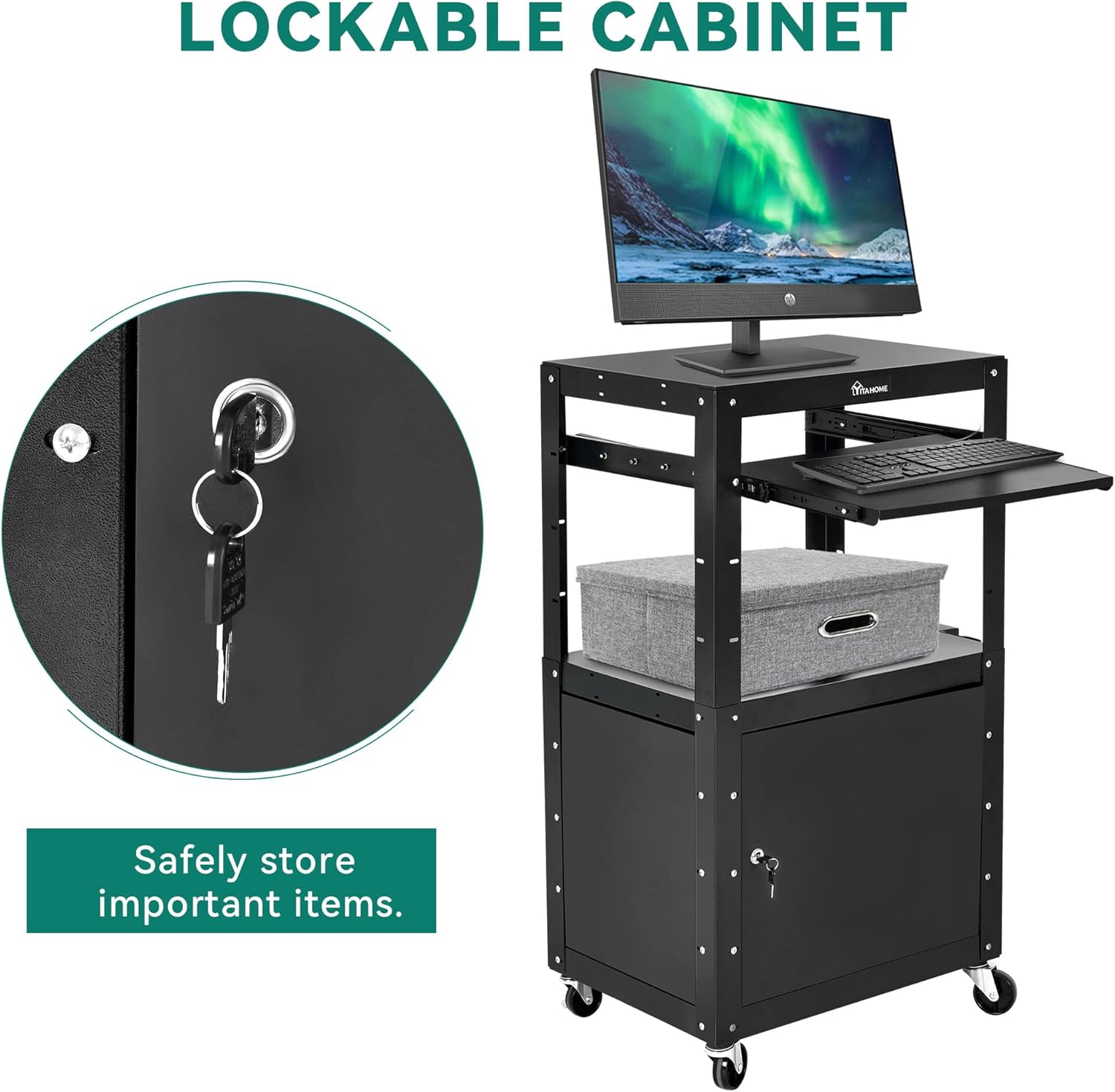 YITAHOME Steel AV Cart with Locking Cabinet, Metal Presentation Cart with Keyboard Tray, Rolling Media Cart with Wheels & Power 16.4ft Extra-Long Cord for Computer Laptop Projector Printer Black