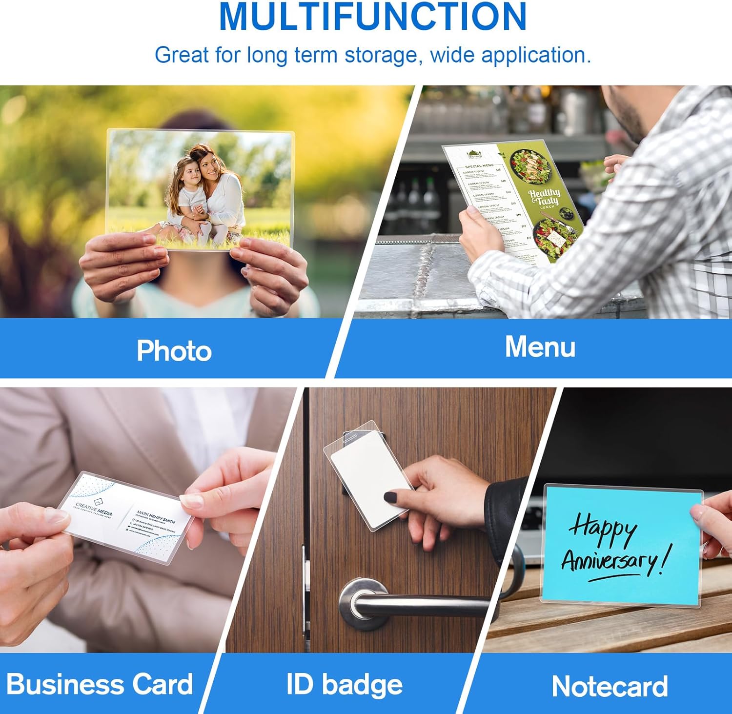 - Multiple Size Options: This product includes laminating sheets in various sizes - 9 x 11.5 inches for letter size, 5.25 x 7.4 inches for photos, 4.25 x 6.3 inches for cards, 3.7 x 5.3 inches for notecards, 2.5 x 4.25 inches for ID badges, and 2.25 x 3.75 inches for business cards. There are 25 sheets for each size.