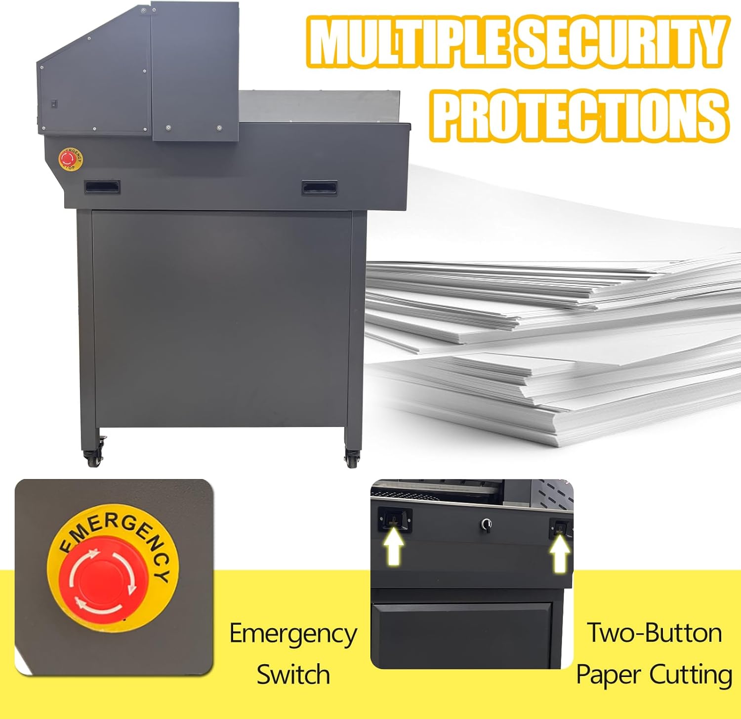 - Safety Protection: Equipped with infrared safety protection device to ensure the safety of operators. Using dual button operation to cut paper, and pressing both buttons at the same time can start cutting, without any accidental touch.