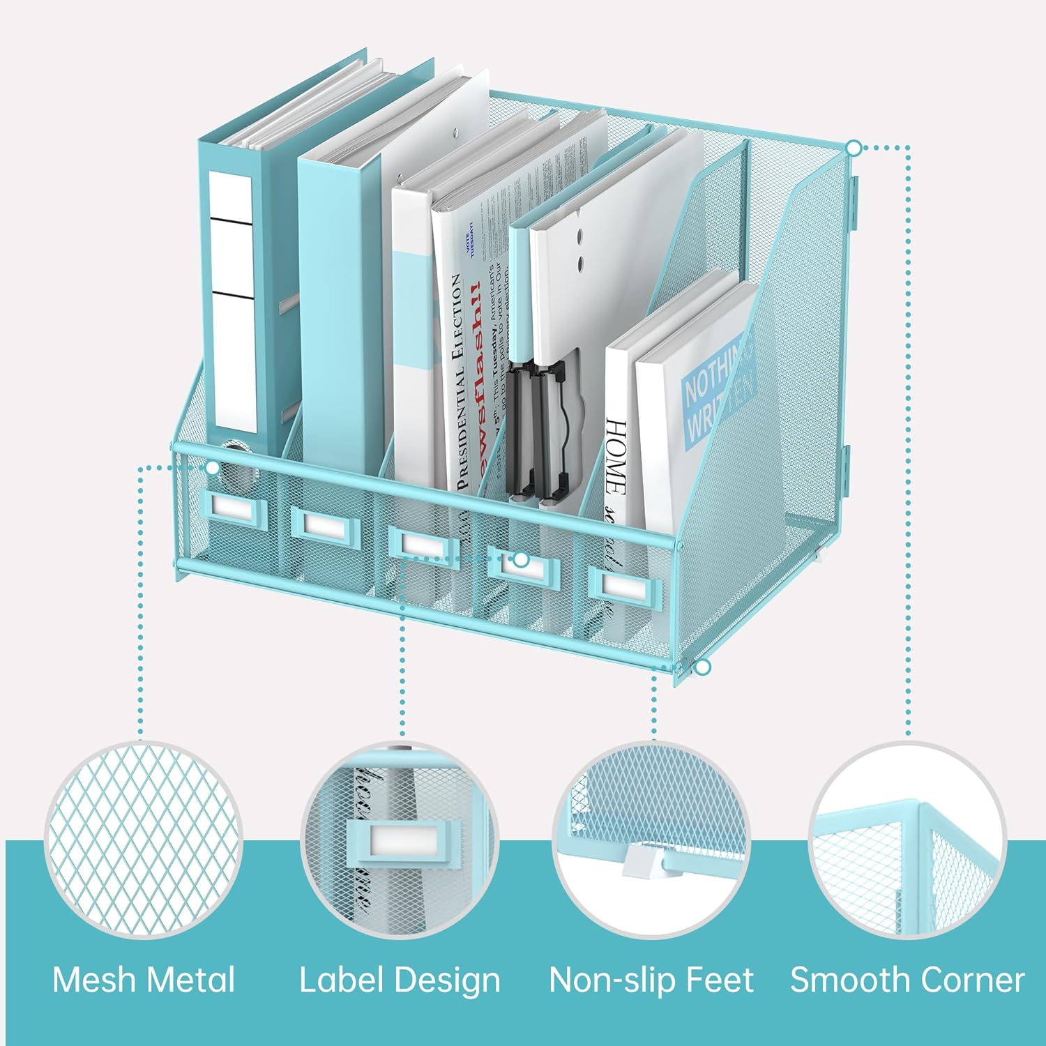 SUPEASY Desk Organizers Metal Desk Magazine File Holder with 5 Vertical Compartments Rack File Organizer for Office Desktop, Home Workspace, Blue Plus