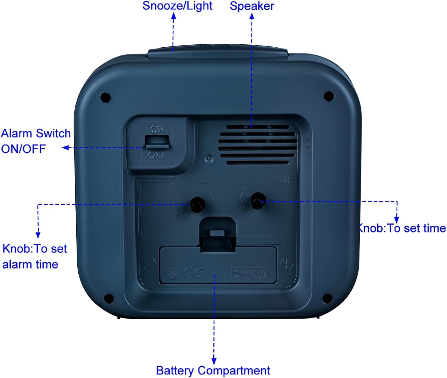 • Large Size-- Size: 5.5" x 5.5" x 2.2",runs on 1 "AA" Battery (not included). Alarm clock stands up at an angle, high quality plastic, square face with white dial, black Arabic numerals, good decoration for tabletop, desk & shelf, bedrooms. Also large size screen and clear bold digits to display time, perfect alarm clock for elderly.