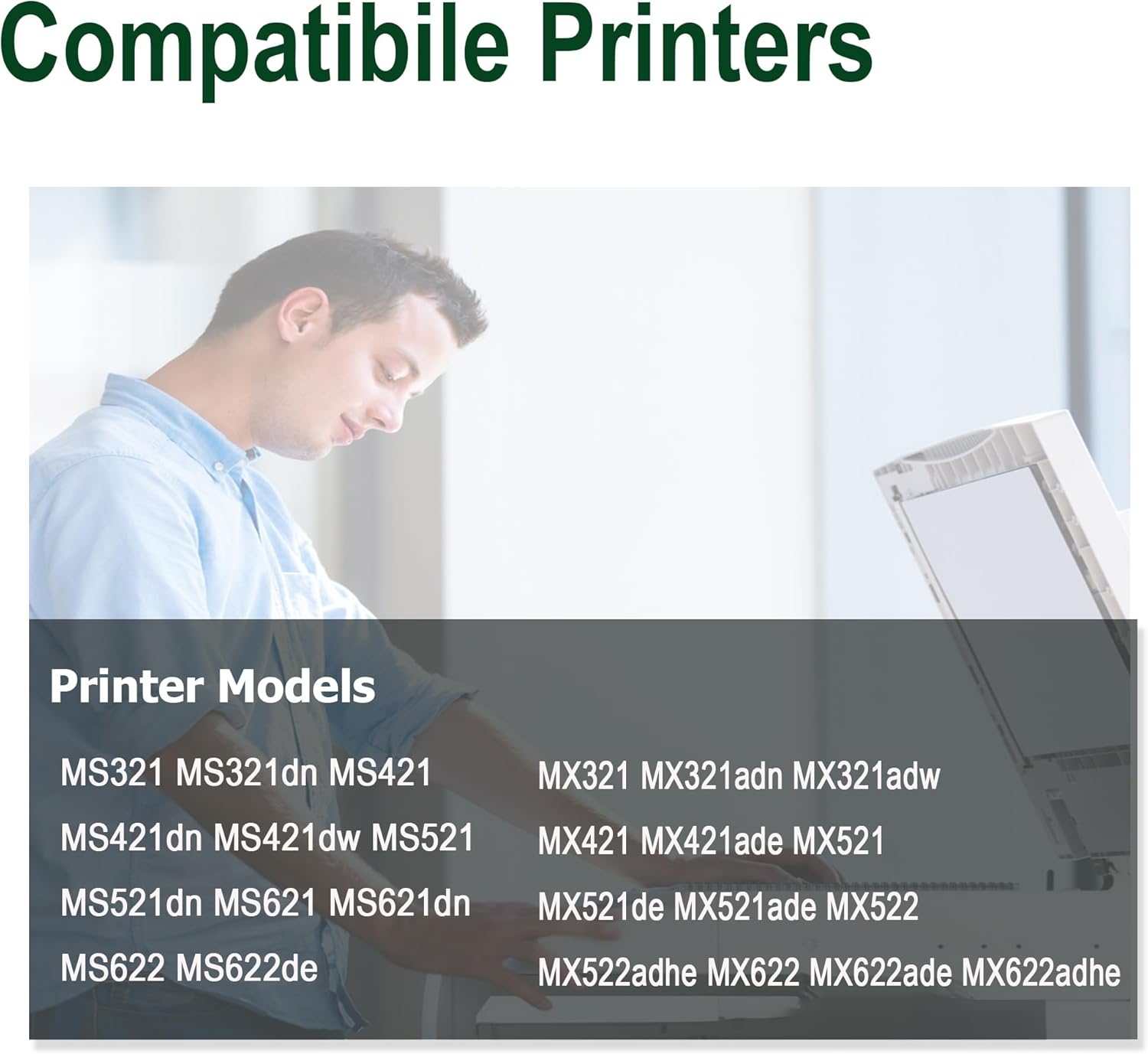 - Compatible Printer:MS321dn, MS421dn, MS421dw, MS521dn, MS621dn, MS622de, MX321adn, MX321adw, MX421ade, MX521de, MX521ade, MX522adhe, MX622ade, MX622adhe laser printer