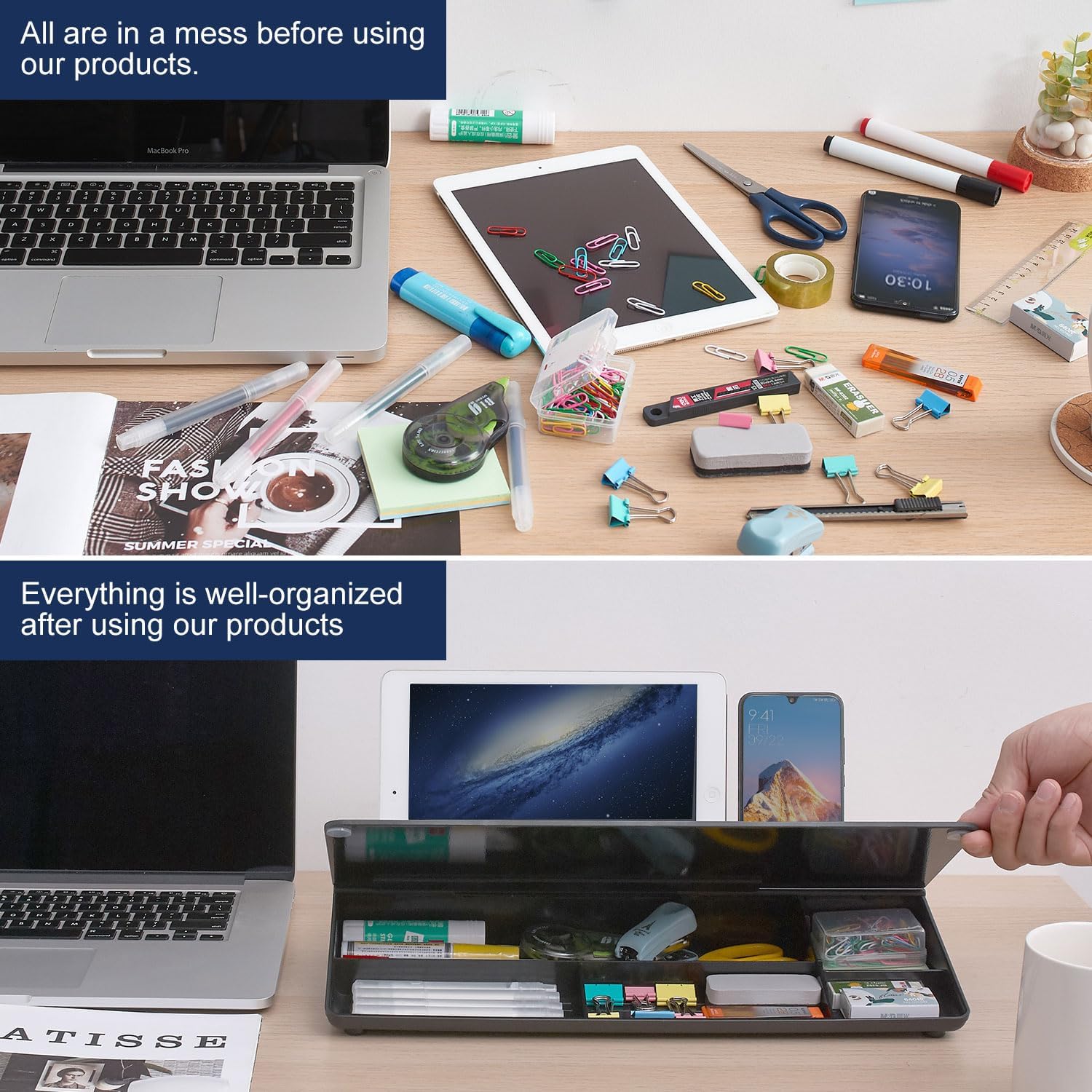- HIDDEN STORAGE & PAD/MOBILE TRAY: De-clutter your desk by storing markers, magnetic eraser and other desktop accessories in the opening drawer or place markers on the accessory tray for quick access. And one more long tray on the top of the dry erase white board for your pad or mobile.