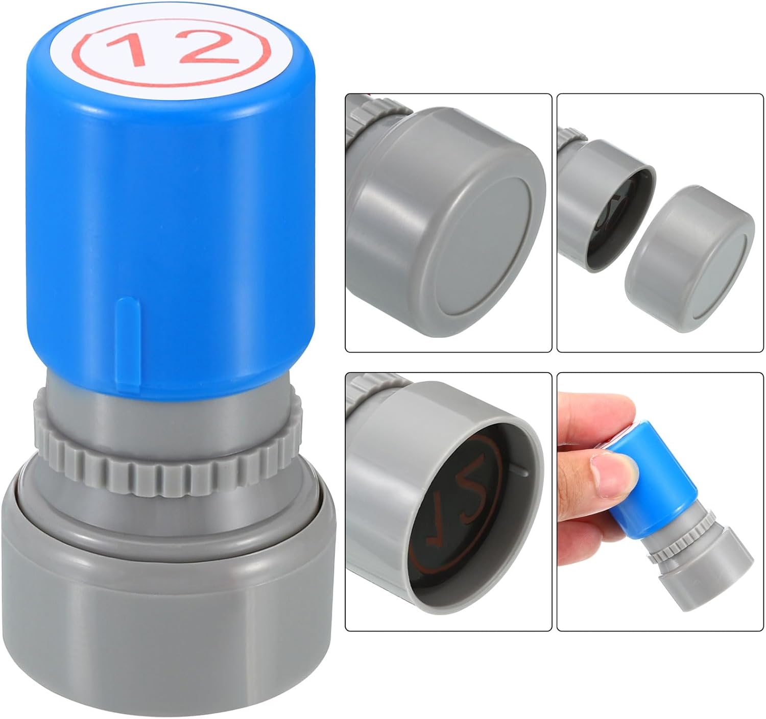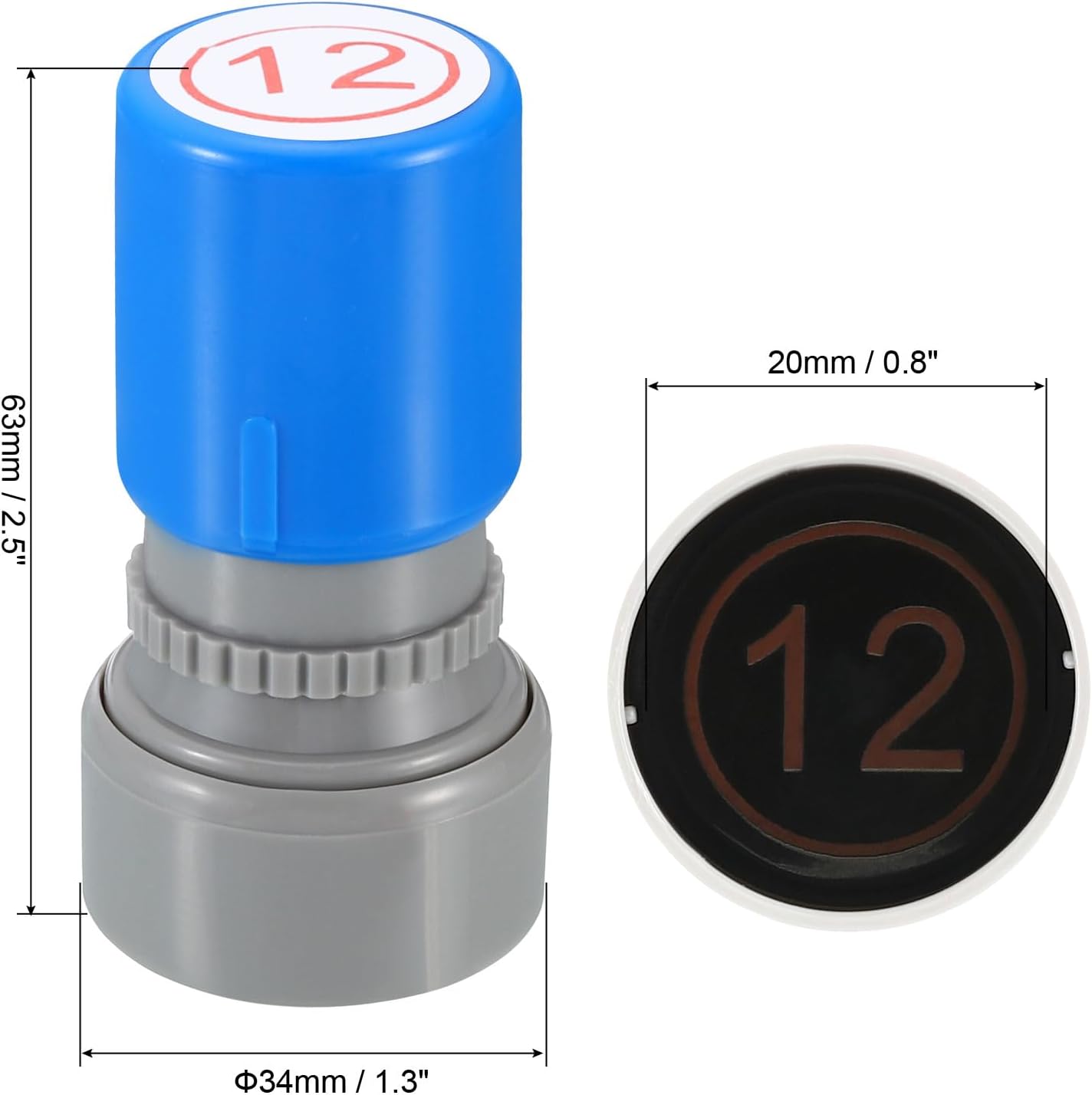 - Ink Color: Red; Shell Color: Blue; Pattern: Digital 12; Material: Plastic; Character Size: 20mm / 0.8 inch; Overall Size: 34 x 63mm / 1.3 x 2.5 inch(D*H); Packing List: 1 x Number Learning Stamp, 1 x Ink