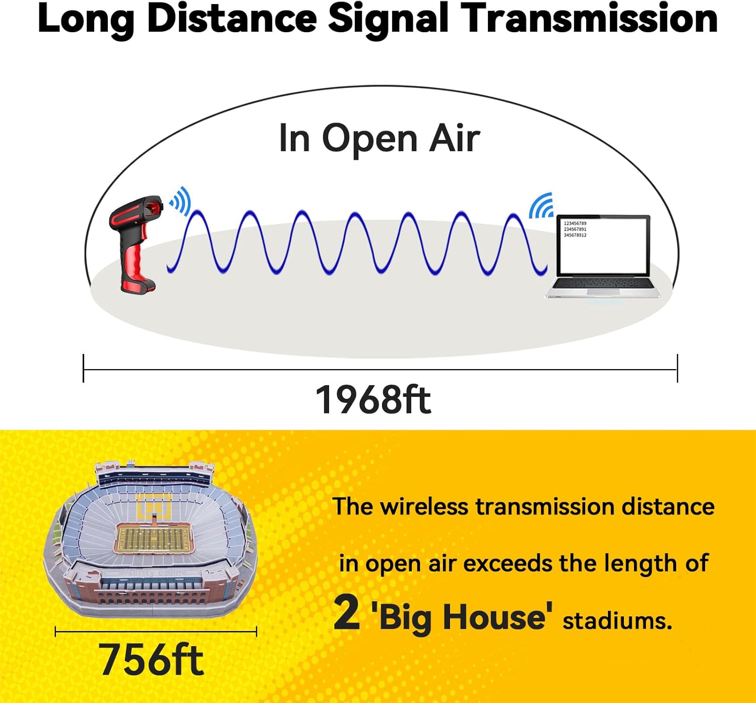 - 【Exceptional Signal Range】 The Alacrity 433MHz RF wireless barcode scanner stands out with its long-distance transmission capabilities. In an unobstructed environment, it can transmit signals up to an impressive 1968 feet (600 meters), and even in environments with obstacles, it reaches a substantial 656 feet (200 meters). This extended range makes it a perfect fit for large warehouses where signal coverage is crucial.