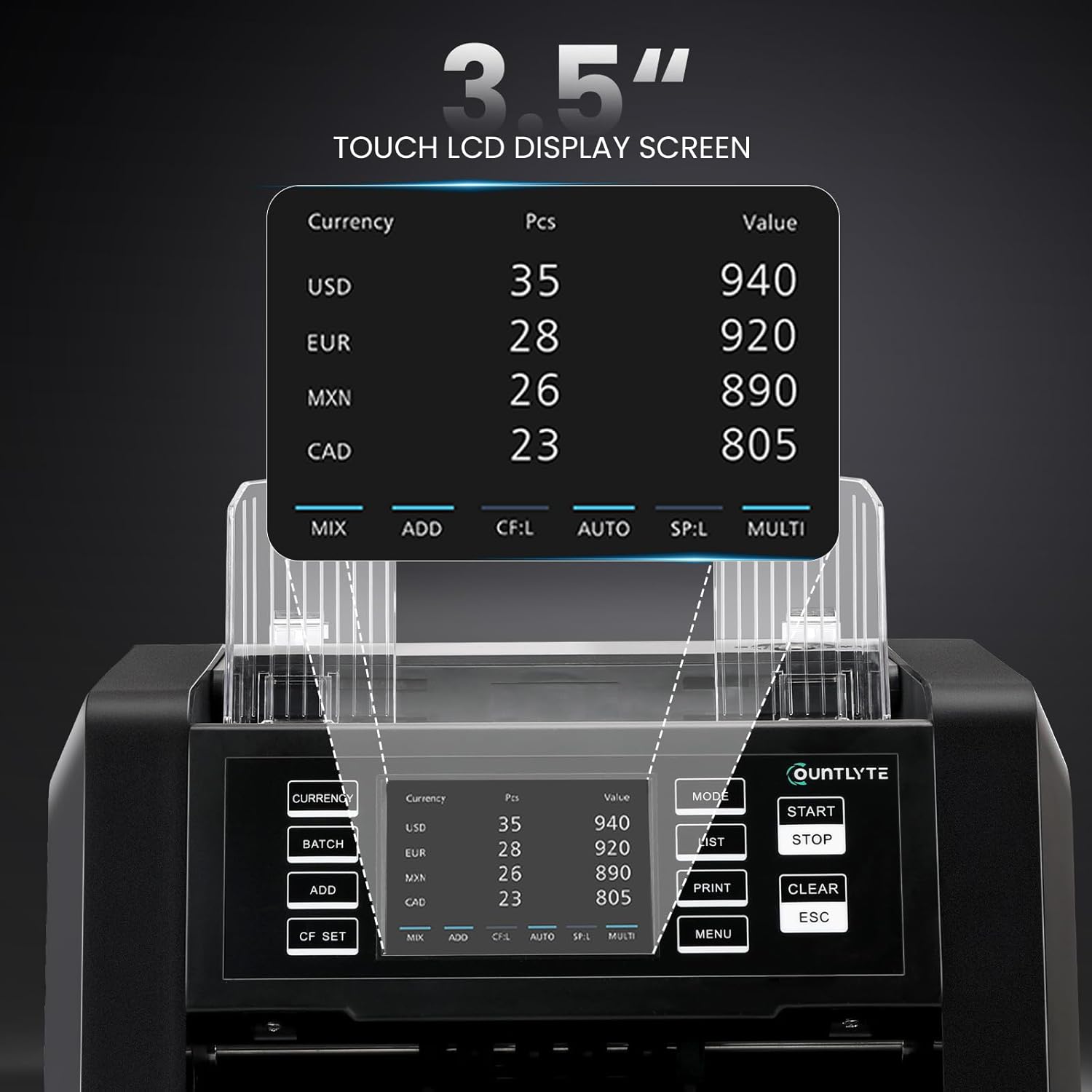 - Easy and convenient to use: The 3.5 inch TFT touch screen and user-friendly menu make cash counting a breeze. Counting speed up to 1200 bills per minute.The machine is easy to carry with its hidden handle, fully opened back cover for easy cleaning, and comes with the option to upload count data to your computer or print details with a printer via serial cable