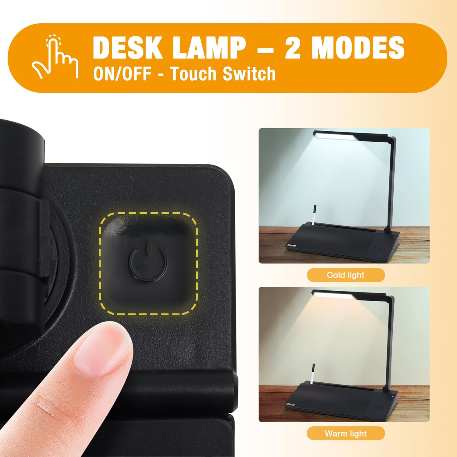 - π‘ DESK LAMP: Fingerprint touch switch, very easy to operate. It contains two modes of warm light and cold light to meet your different scenarios. 4 rotatable parts, freely adjust the directions and angles for easy use.