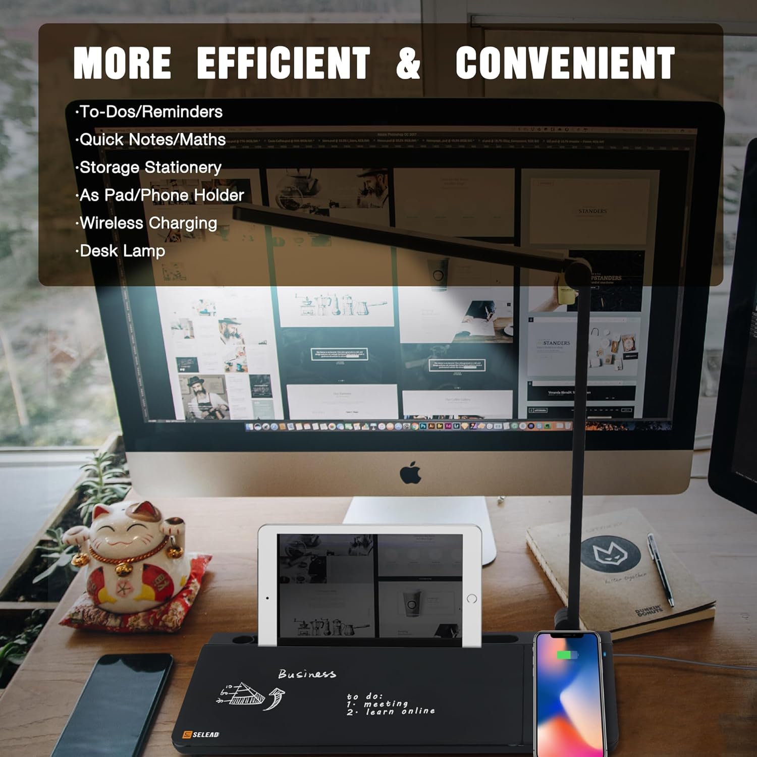 - β MULTIFUNCTIONAL: Storage, wireless charging, lighting, write, mirror, hold, keyboard stand, our desktop white board is an all in one multipurpose board. Equipped with 1 adapter, 2 black dry erase markers, 1eraser and 5ft USB Type C cable, instructions.