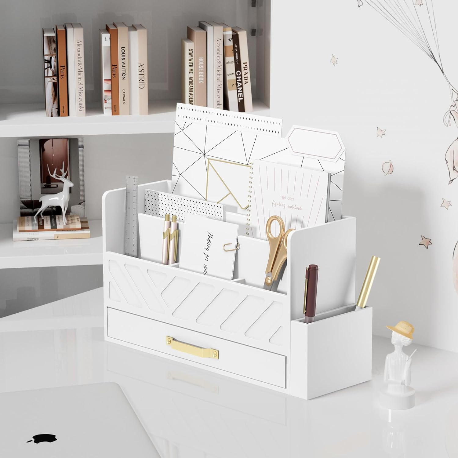 - Stylish office desk organizer: Upgrade your workspace with this stylish desk organizer, enhanced with gold mental drawers perfect for desk organization and file storage, With its sleek design for all your desk accessories, this desktop organizer is not only functional but also adds a touch of sophistication to any home office or work desk.