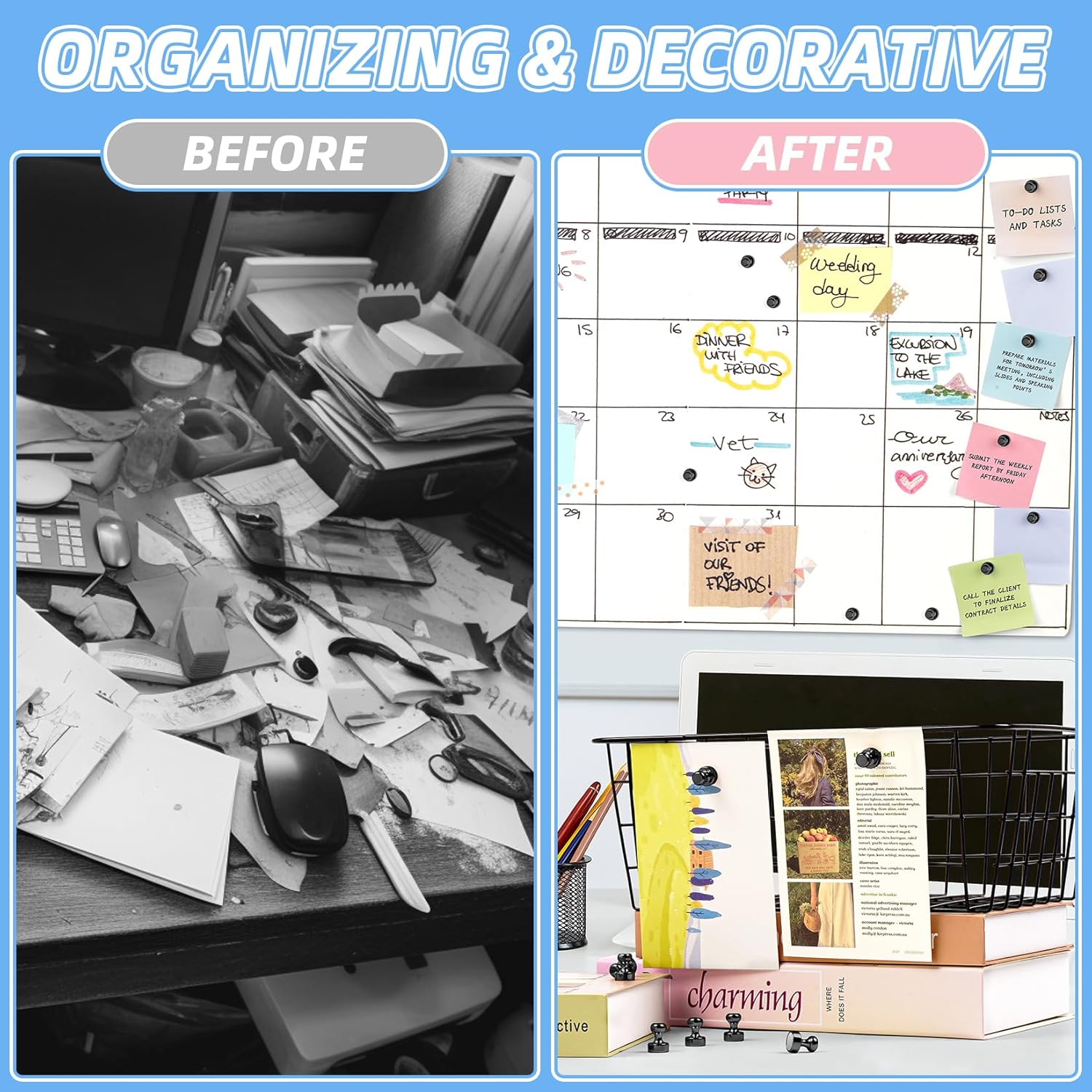 - Versatile Use: These small strong magnets are perfect for keeping your kitchen, office, or classroom organized. Use these magnetic push pins on magnetic surfaces like whiteboards, refrigerators, lockers, and bulletin boards to display notes, photos, calendars, greeting cards, recipes, schedules, artwork, or memos. They’re also ideal for practical uses like hanging jewelry, keys, utensils, or small tools, making them a must-have for both creative and functional spaces.