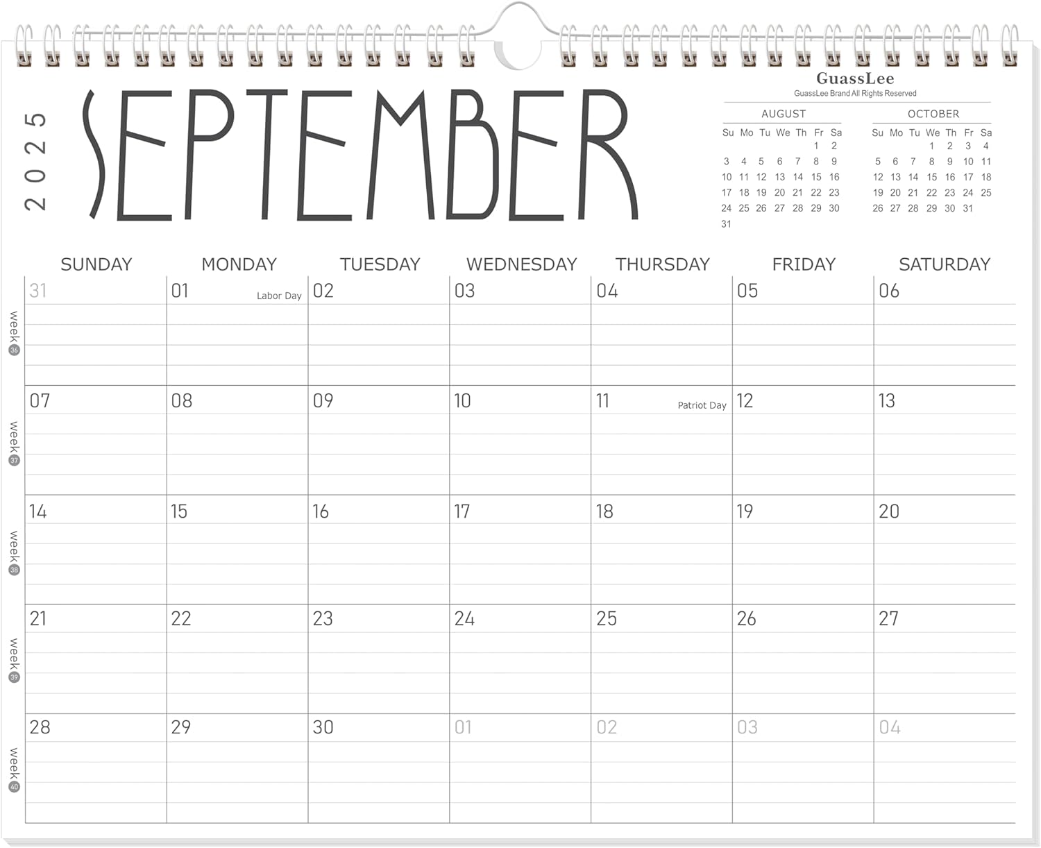 GuassLee 2025 Wall Calendar - 12 Monthly Calendar from September 2025 to August 2026, 14" x 11" 2025-2026 Hanging Calendar with Spiral Binding Week Numbers for School Home Office Planning & Organizing