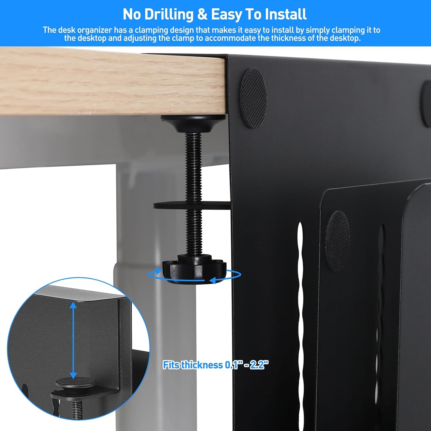 - 【Clamp Under Desk Storage & No Drill Design】Our clamp on side desk storage requires no drilling or tools. The rubber cushion prevents scratches on desks and other objects, and the rounded corners design also helps avoid scratches.