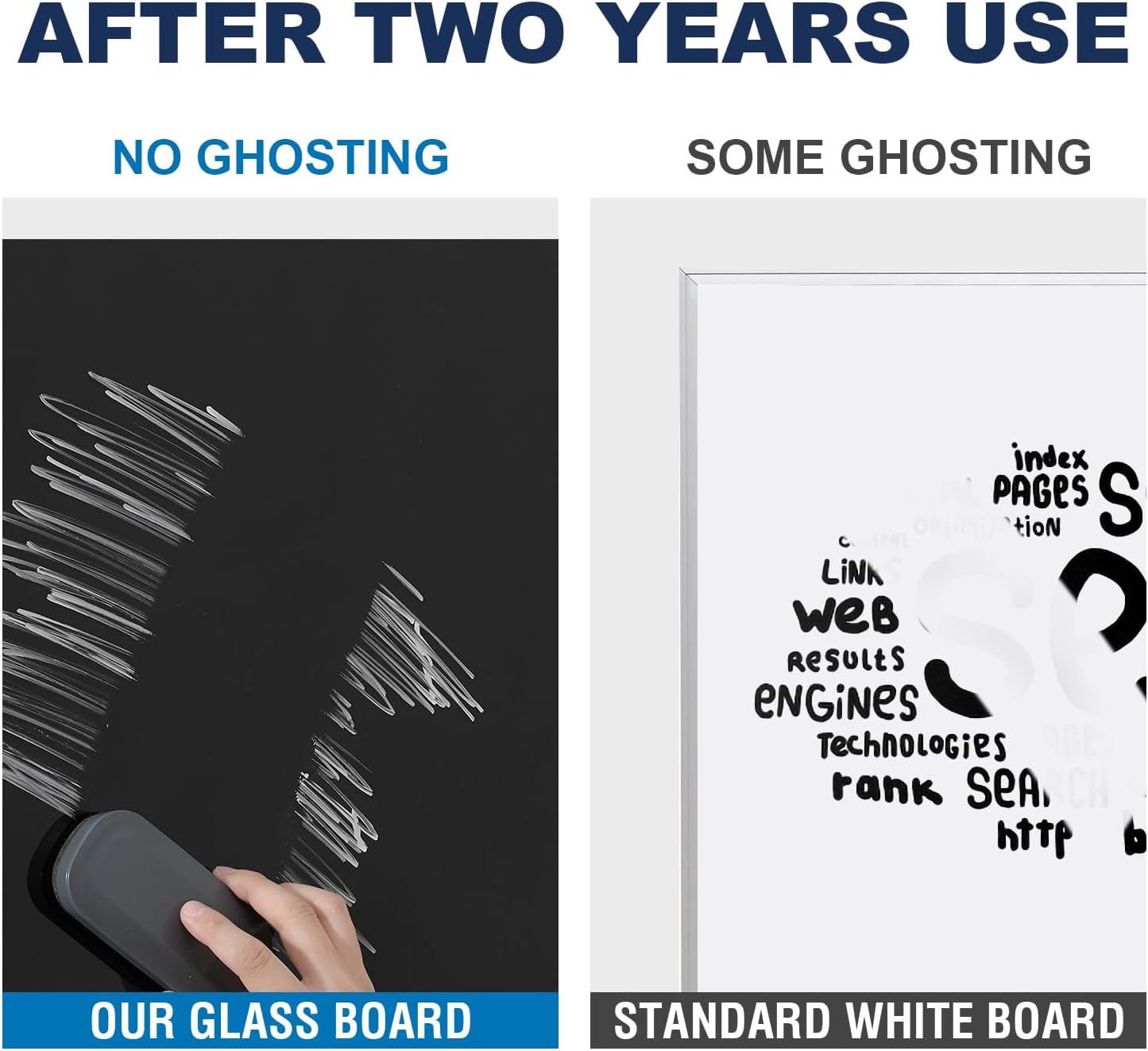 - FRAMELESS DESIGN - The frameless design appears to float on the wall and its fashionable looks adds advanced and texture impression, elevate your office or home. Ideal for heavy writing use in an office, at home or any commercial environment.