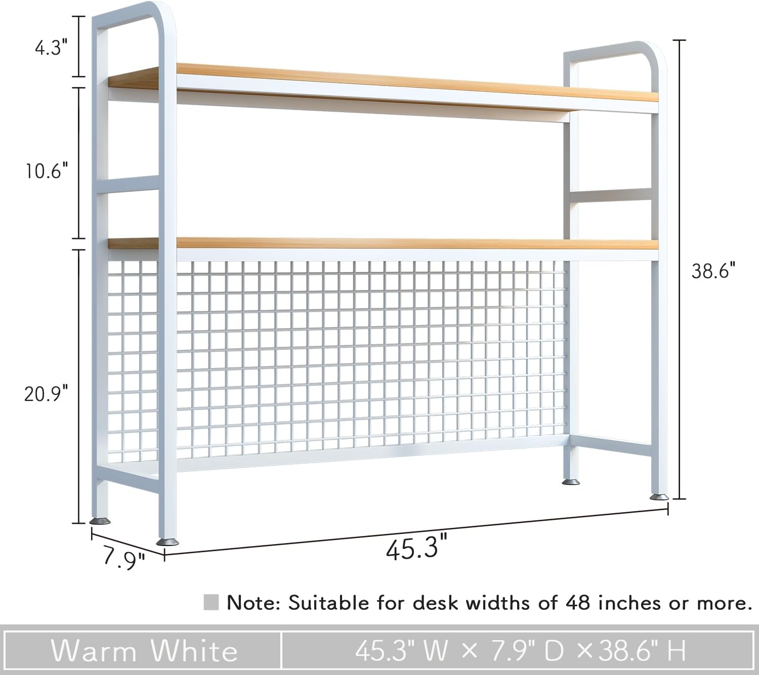 IOTXY 2-Tier Desktop Hutch Bookshelf - Metal Desk Shelf Bookcase with Grid Panel, Countertop Storage Organizer Rack for Dorm or Office, White, 45.3" W