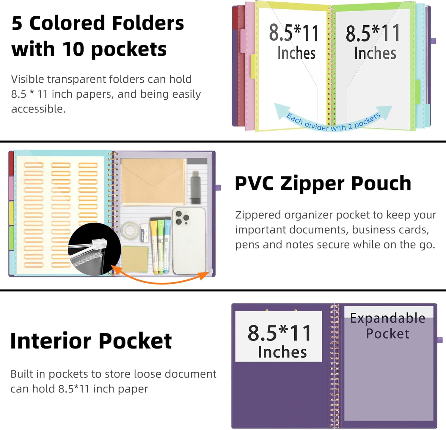 - 【Stay Organized】The portfolio organizer features a clear, zippered pouch for secure on-the-go storage of documents and notes, interior pocket to store letter size papers and important loose documents. Clipboard comes with 5 extra Plastic Colour Folders with 10 pockets fit in all standard US letter size sheets(11*8.5''), plus 39 file folder labels self adhesive stickers for organized use.