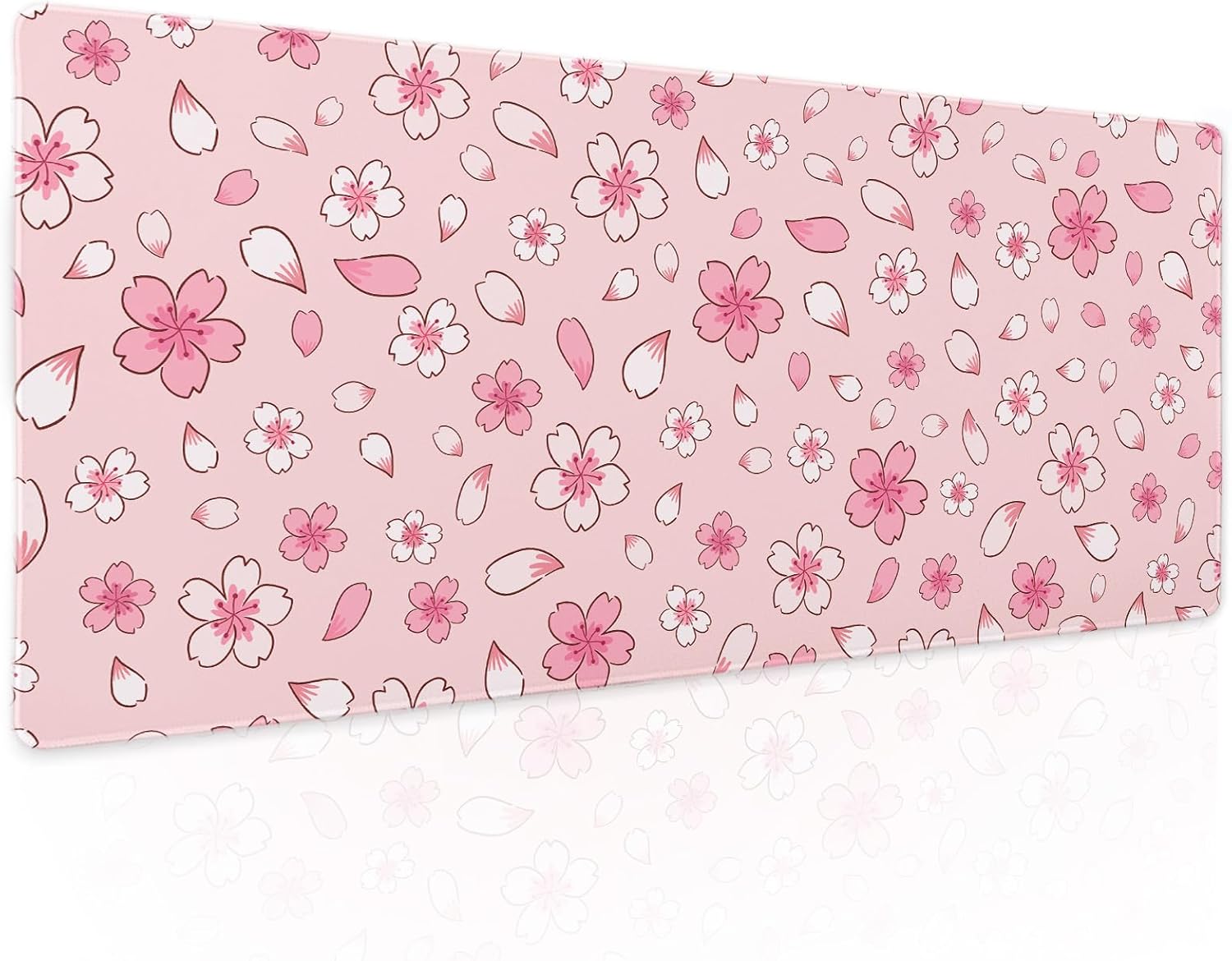 Pink Cherry Blossom Gaming Mouse Pad XL Cute Anime Aesthetics Floral Extended Kawaii Flowers Large Mousepad Non-Slip Rubber Base Stitched Edge Long Keyboard Desk Mat for Computer,31.5×11.8 Inch