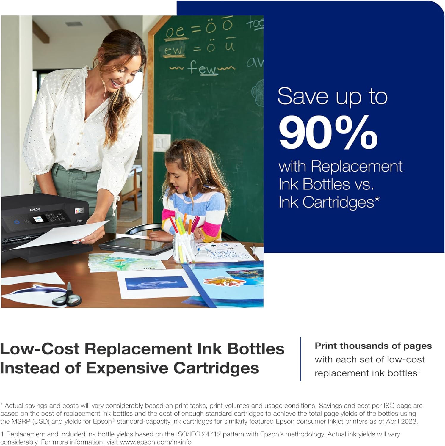 - Product 2: Dramatic Savings on Replacement Ink ― Save up to 90% with replacement ink bottles vs. ink cartridges (1) – that’s enough to print up to 7,500 pages black/6,000 color (2), equivalent to about 90 individual ink cartridges (3)